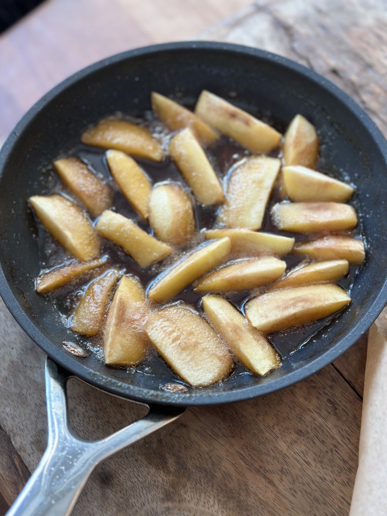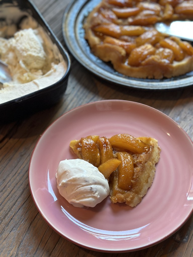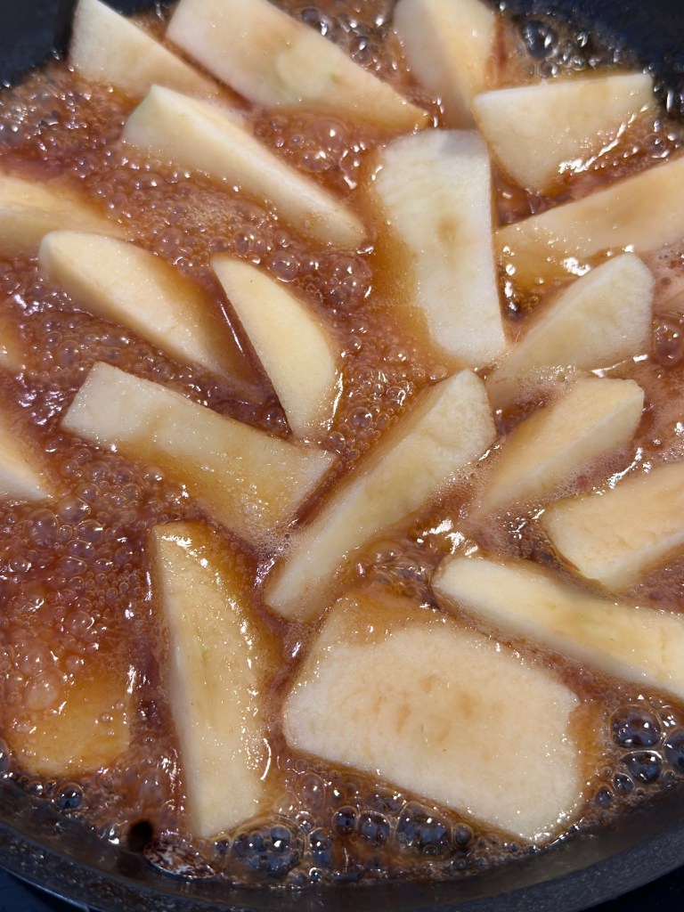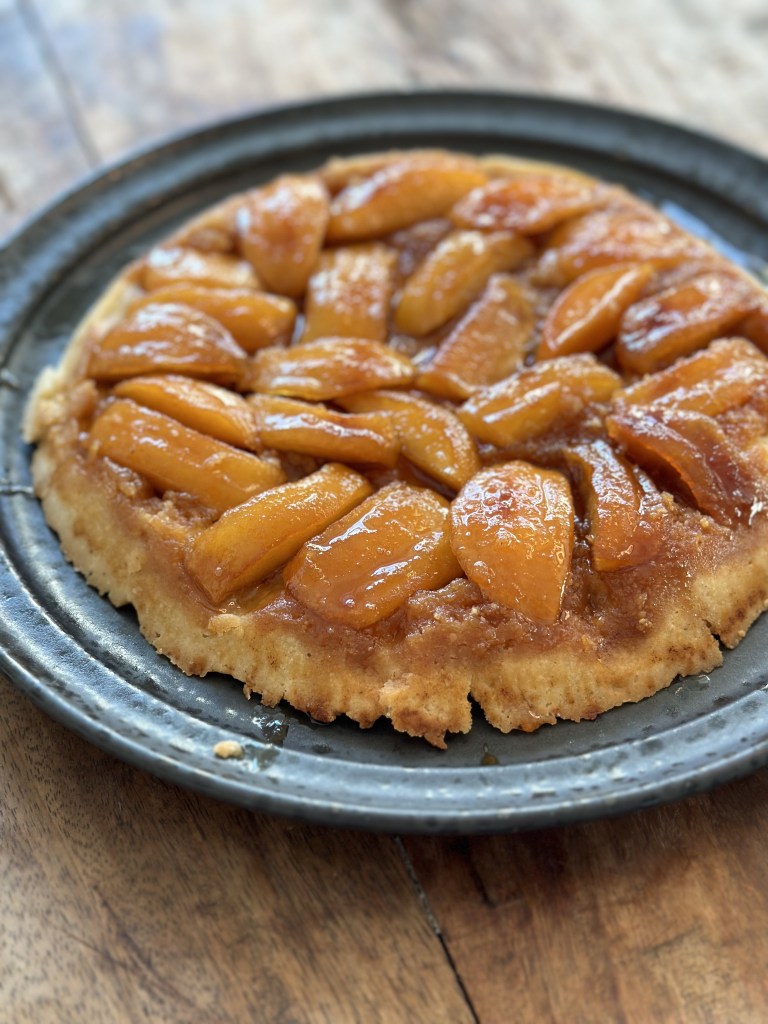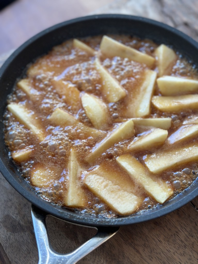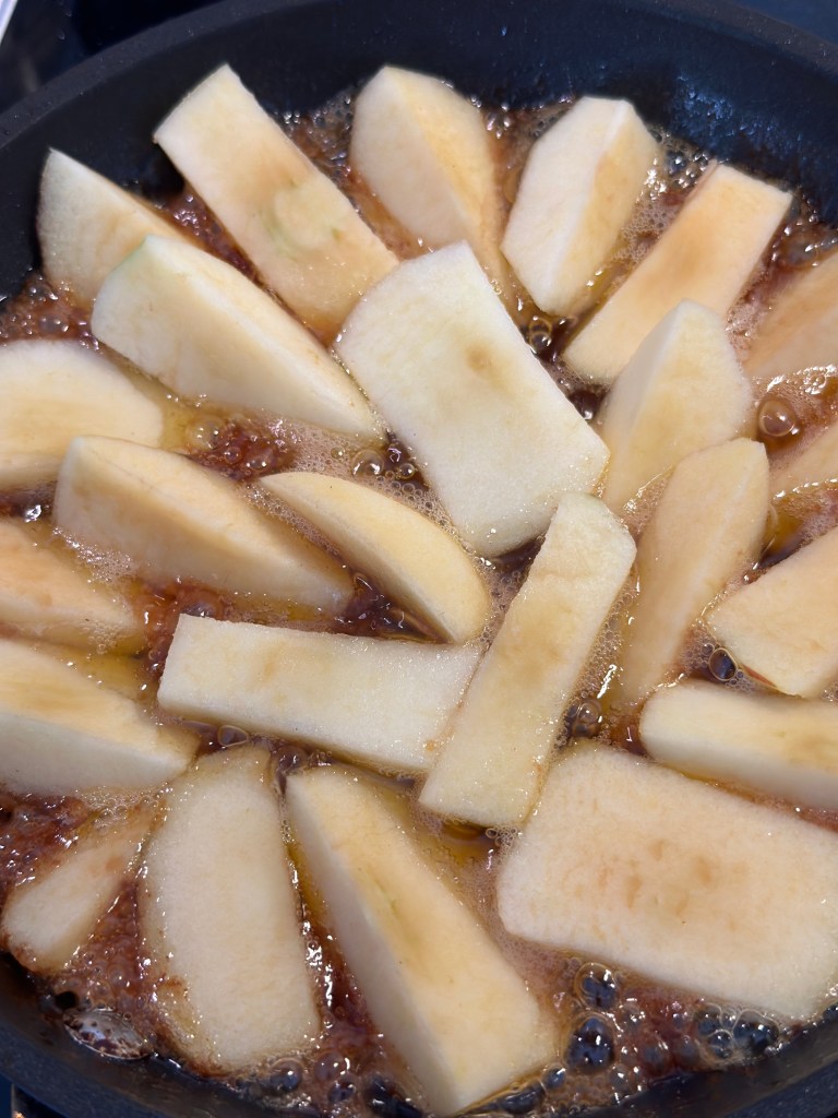 Start med at skrælle æblerne – det ham sagtens være syrlige æbler, men ikke over-modne. Fjern huset, og skær hvert æble i 8 stykker. Dernæst tag lige dele sukker og smør. Sukkeret placeres på en varm pande som dels kan tåle at komme i ovnen, men og slip-let. Når det næsten er smeltet, tilfører du smør. Når smørret er smeltet og blevet “et” med sukkeret til karamel, monterer du æblestykkerne – gerne udefra rundt og ind mod midten og rundt, så den bliver nemmere at skære. Skru lidt ned for varmen, men karamellen skal have lov til at “fusionere” med æblerne, så de skal være ovre et stykket tid – men gør nu ikke som Stéphanie og brænd på…