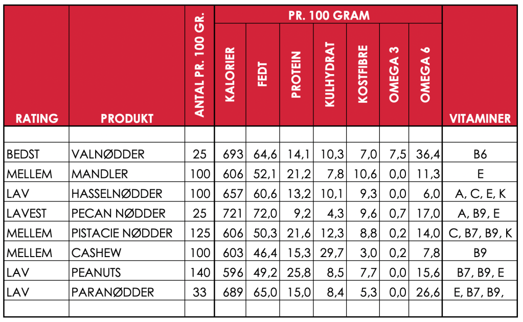Nødder er i virkeligheden et frø med skal på. Og nogle er slet ikke nødder, men frugter. Nødder er gode kilder til protein, fibre, fedt, vitaminer og mineraler. Nødder, som samtidig er rige på den gode fedt, findes i mange varianter – f. eks Mandler, Valnødder, Pecans, Peanuts, Hasselnødder og Pistacienødder. Nødder er virkelig gode alternativer til slik, men er man på slankekur, skal man være opmærksom på det høje kalorieindhold.