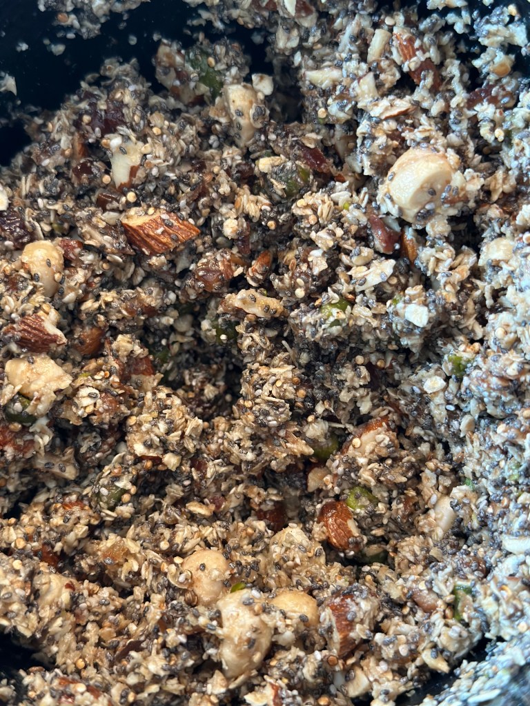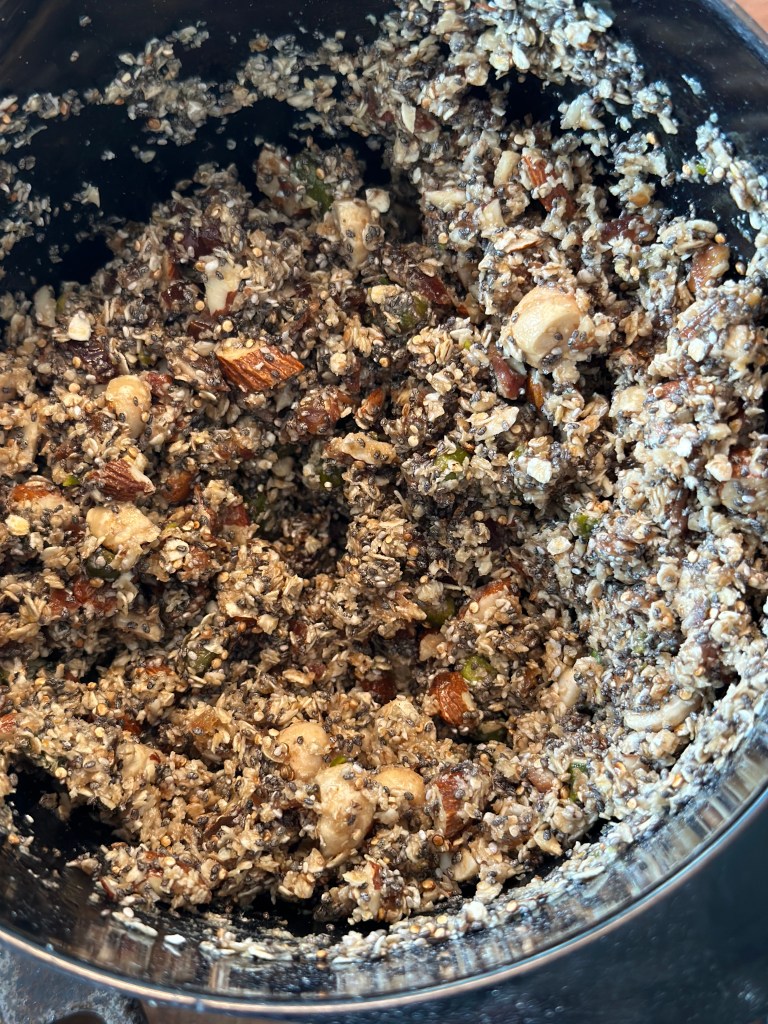 Hak nødder groft. Hak dadler fint. Bland herefter alle ingredienser, hvor man tilføjer siruppen som det sidste. Brug gerne en røremaskine.