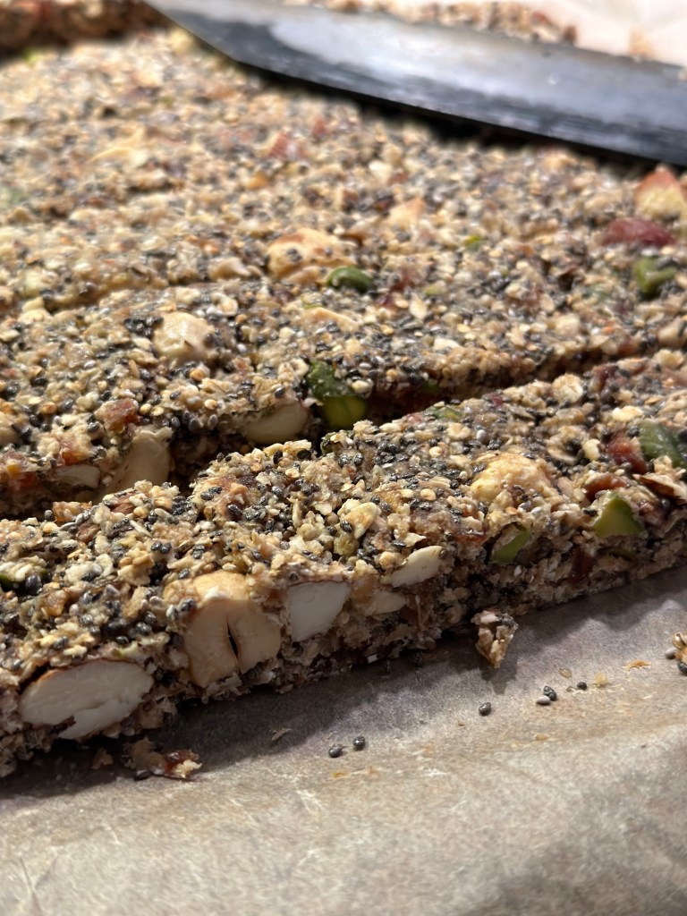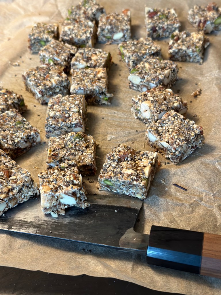 Når det er kølet, kan du skære dem i stykker. Jeg laver nogle små “hapser”, da jeg således kan dossere bedre i forhold til kalorie indtag – en “hapser” er ca. 100 kalorier.