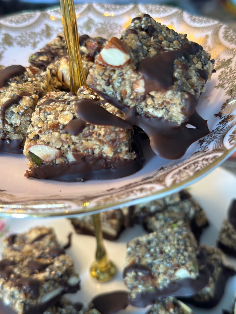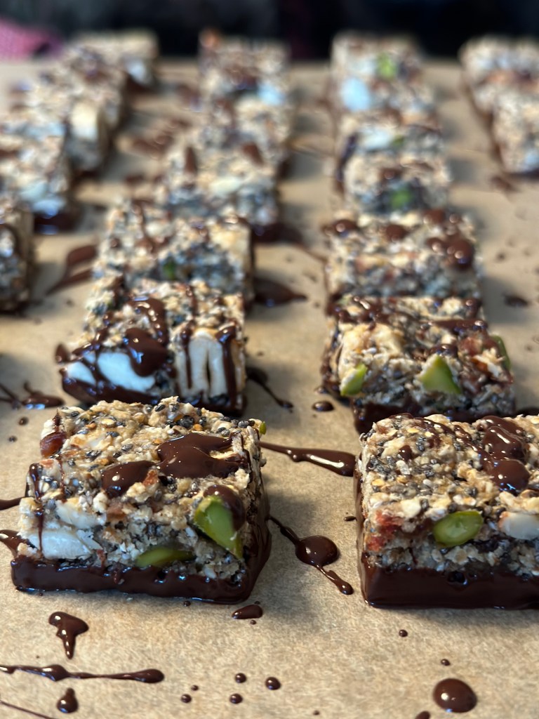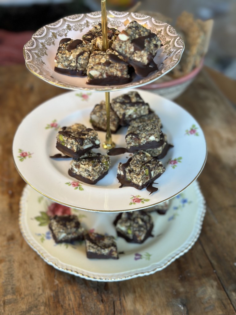 Jeg dypper dem i 66% mørk chokolade – mere synes jeg bliver for bitter, men du kan frit vælge. Og så drypper jeg lidt henover for at gøre dem ekstra lækre.