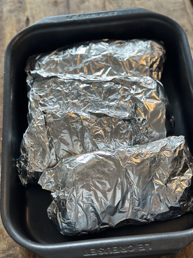 Blandes godt sammen om knubbet ind i kødet, som pakkes ind i sølvpapir.