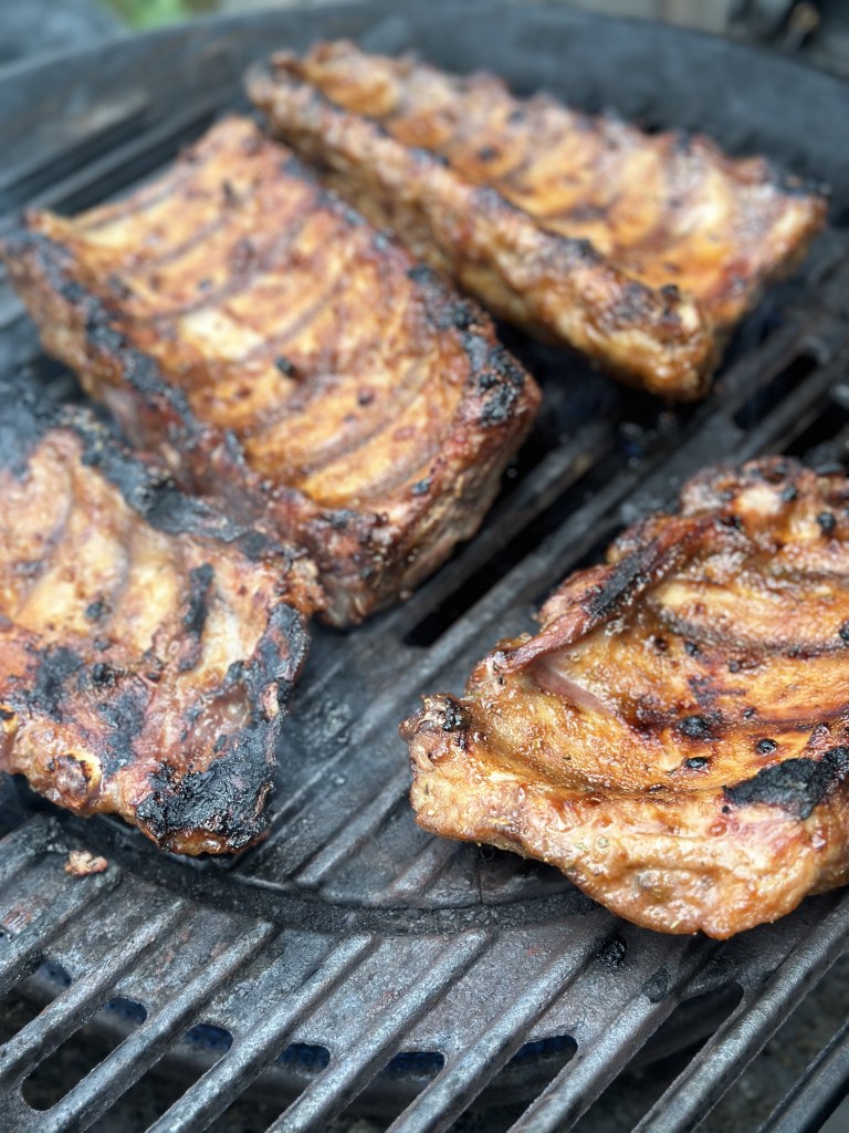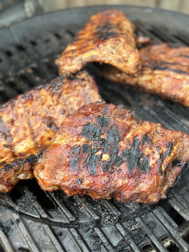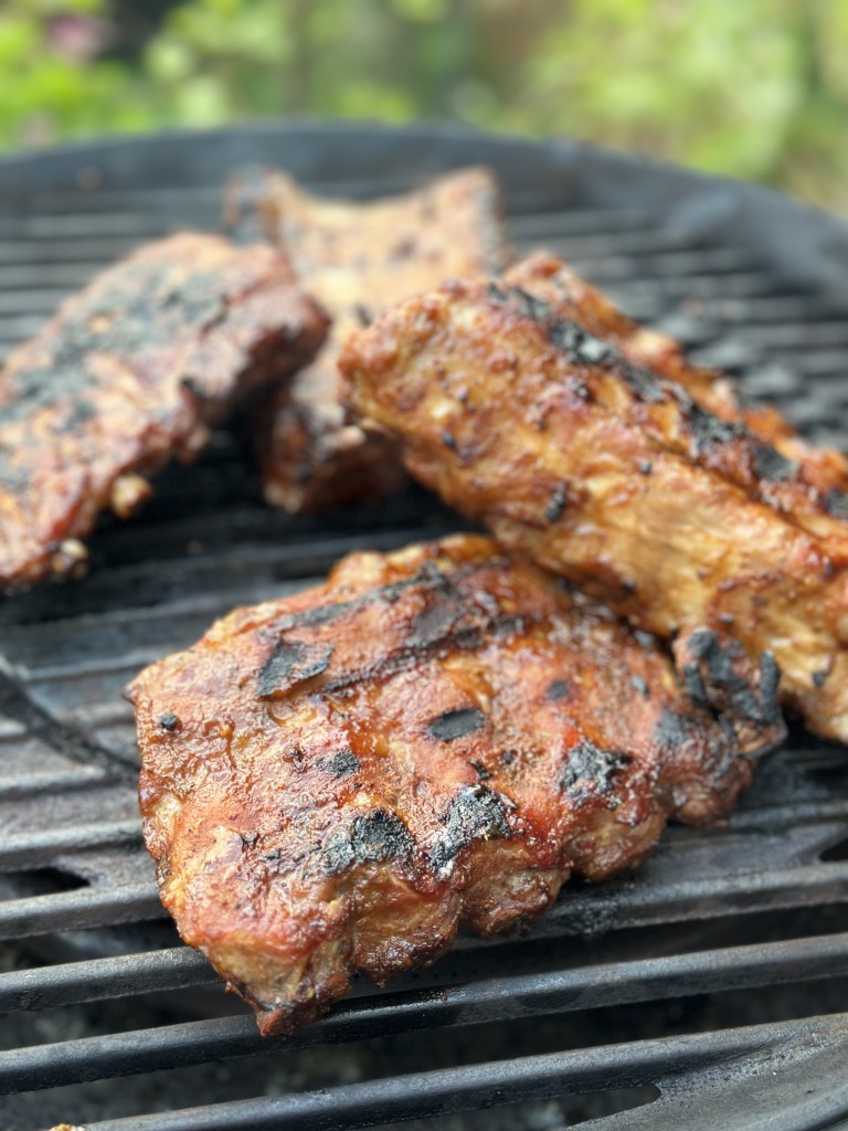 Når marinaden er smurt ind i de forstemte spareribs, kommer jeg dem på grillen på direkte varme – og her skal du holde øje med dem, så de bliver karamelliseret, men ikke for brændte.