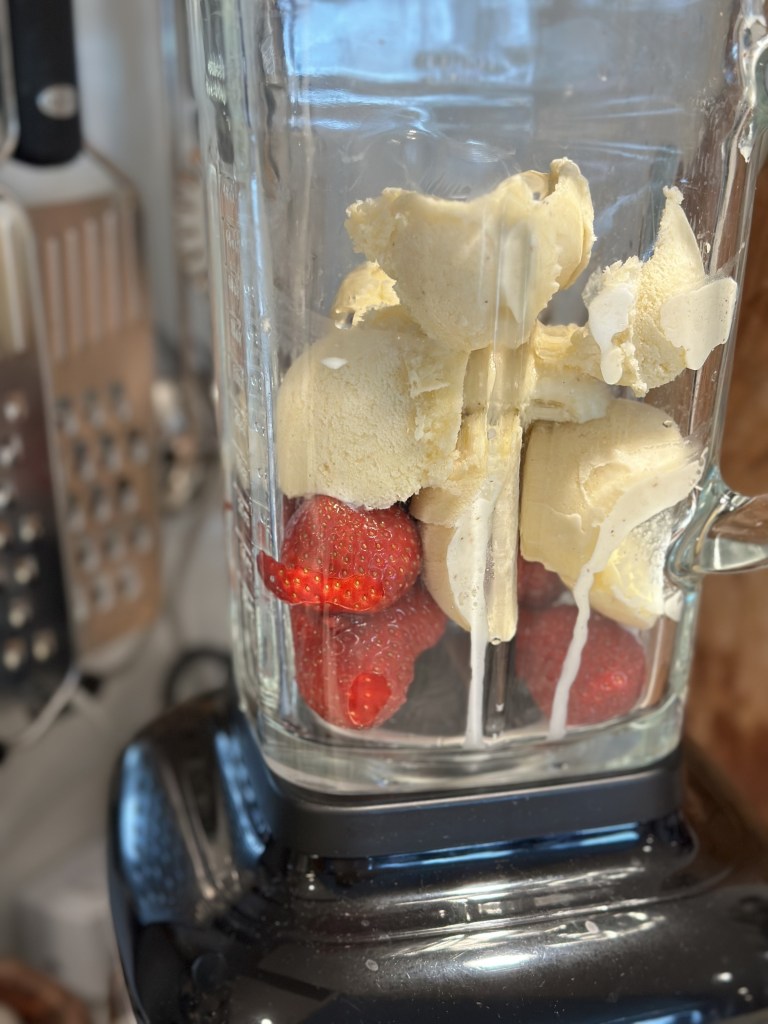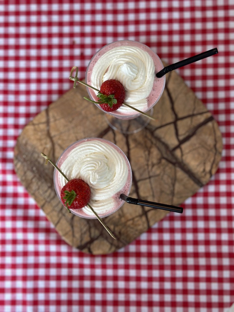 Det hele blendes godt og hældes på et glas, med laktosefri flødeskum på toppen og et frisk jordbær som pynt.