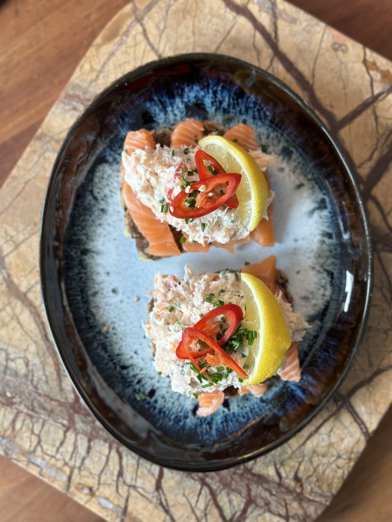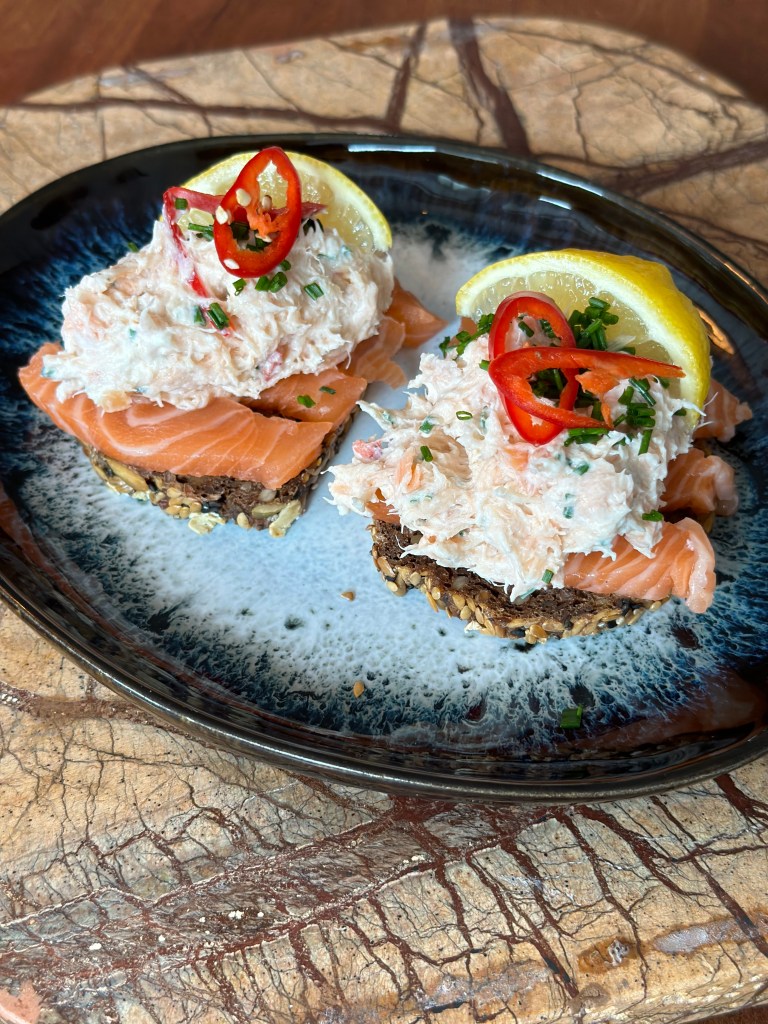 Du kan bruge laksesalat til mange ting. Jeg har denne gang lavet det som rugbrødsmadder med laksroyal i bunden, men det fungerer også på en spinatvaffel eller en blinis.