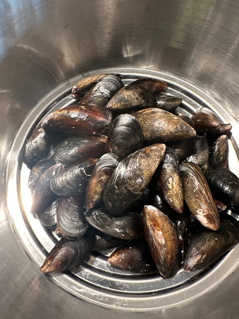Jeg køber mine muslinger hos fiskehandleren. De skal rensen uden på og tjekkes at ingen er åbne eller sprækket – disse kasseres.