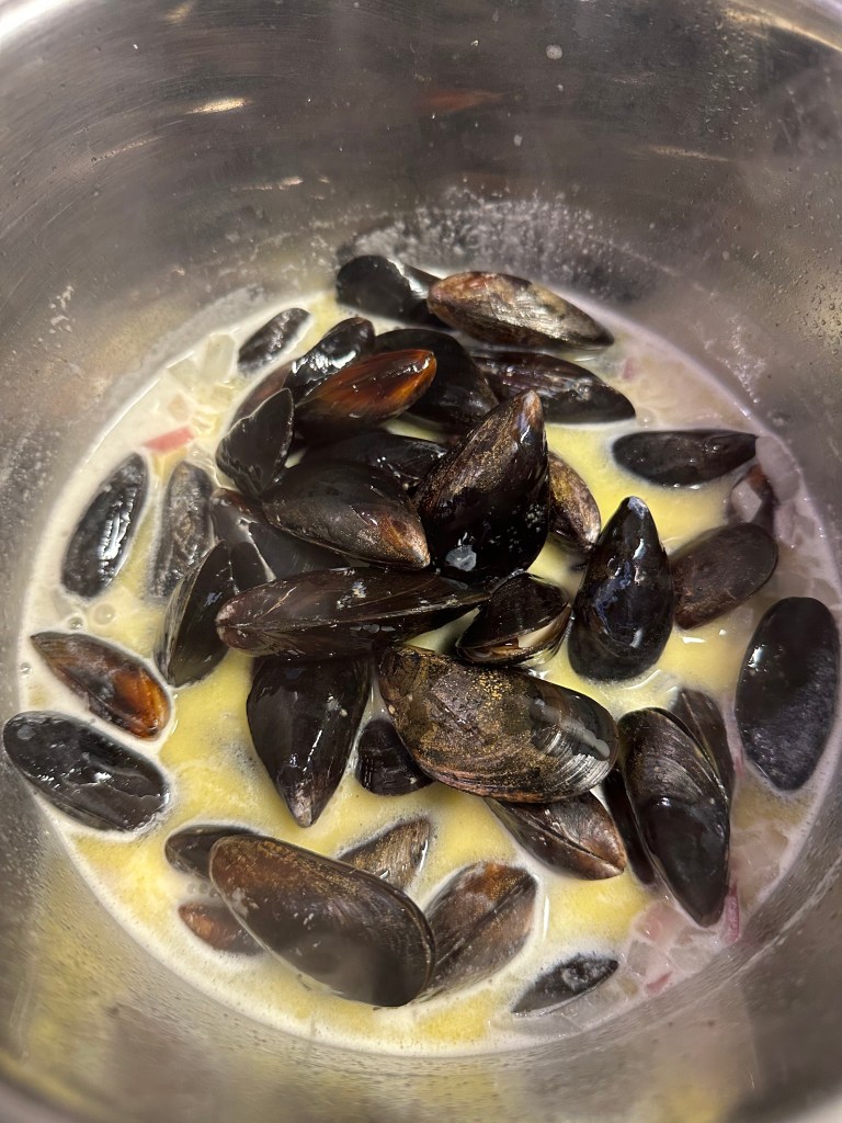 I en gryde steger du et løg i rigelig med smør – det skal blot “klares”. Efterefter tilsættes en halv flaske hvidvin og en dl piskefløde, salt og friskkværnet peber. Lad det simre lidt sammen inden du tilfører de rensede muslinger.