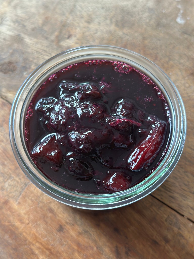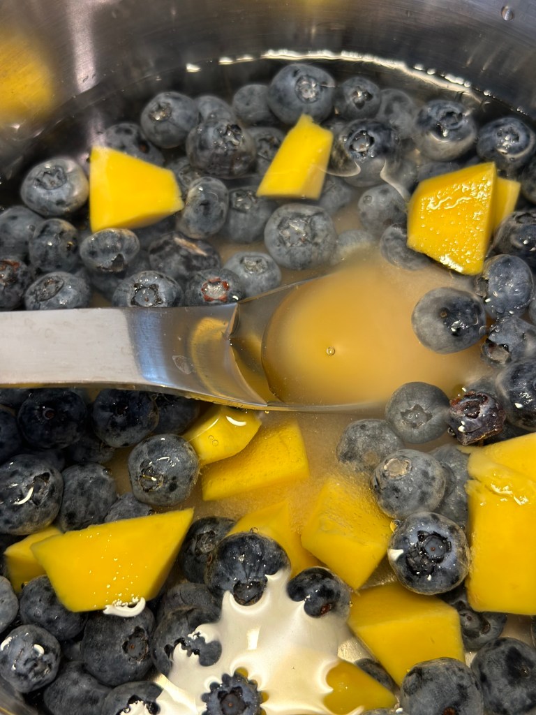 Marmeladen her, er blot en stor håndfuld blåbær, og en halv stor mango i små tern. Vandet skal blot dække frugt og bær, og så tilsætter jeg 2-4 spsk økologisk rørsukker (jeg kan bedst lide den med 2 spsk rørsukker, men mere syrlig). Først koger det op, og så simrer det til væden er kogt ind til en lækker sirup – stivner lidt mere når marmeladen bliver kold.