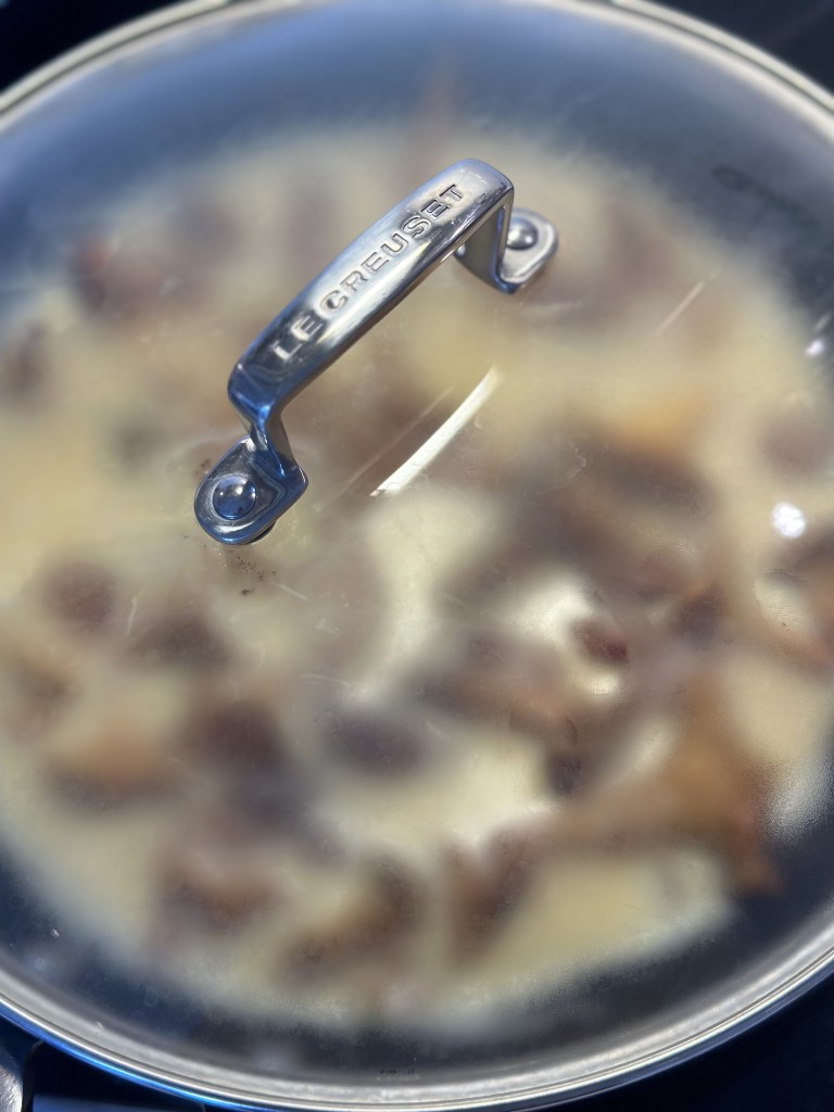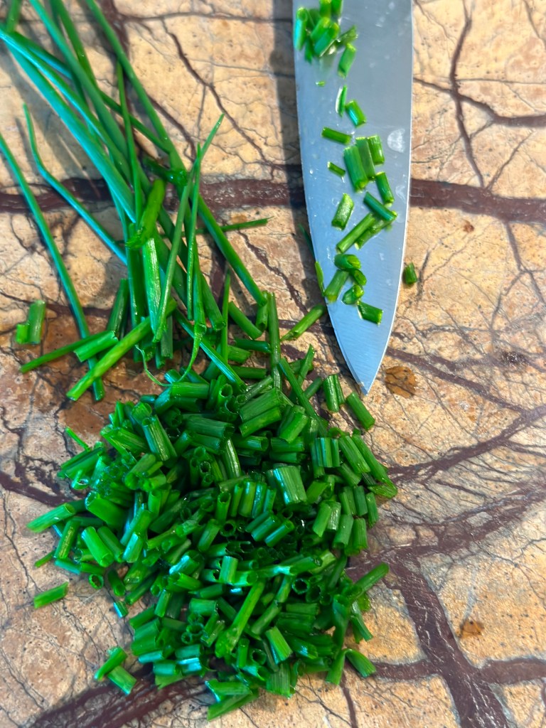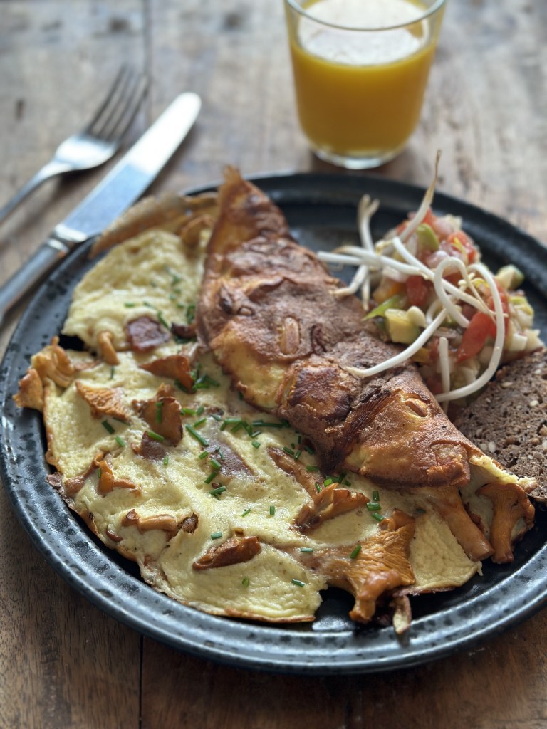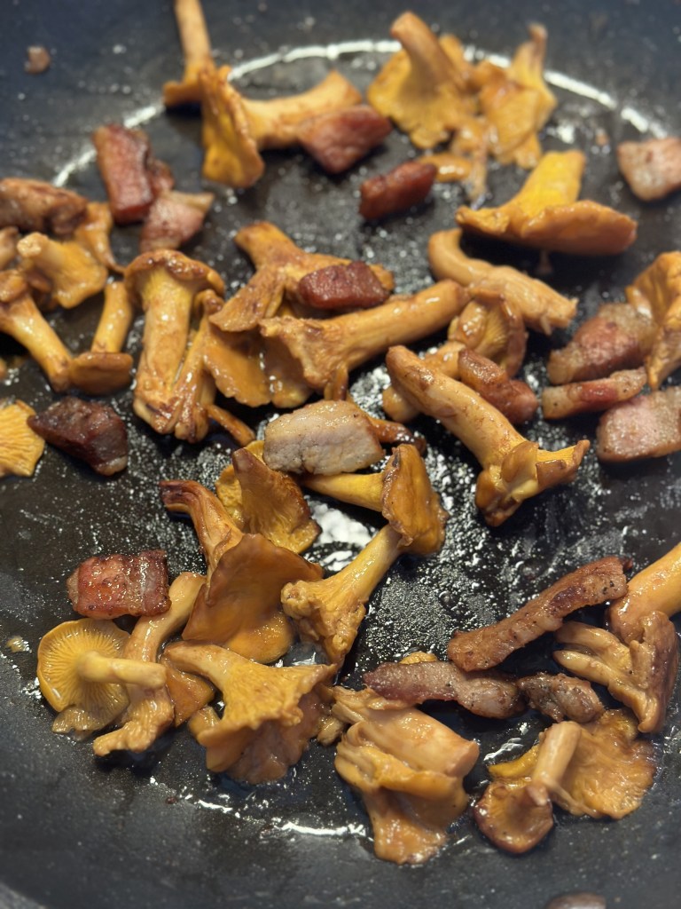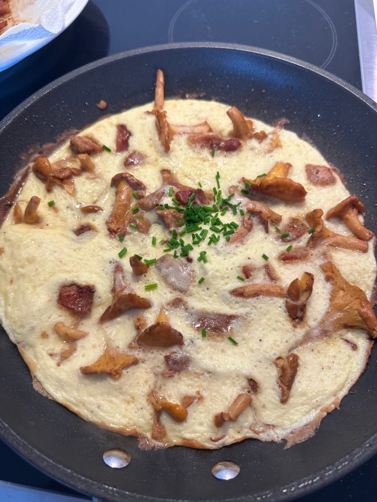 Sauter kantereller og steg bacon. Tag lidt af fedtet fra. Tilsæt æggemassen og sæt låg på. Pynt med purløg, og jeg serverer en lille salsa til som består af :