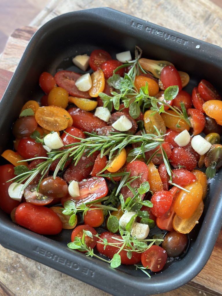 Skær dine tomater i halve eller kvarte – alt efter hvad du synes. Skræl hvidløg og skær dem i mindre stykker. Tag et par stilke Timian, Rosmarin og Oregano – du behøver ikke fjerne stilken. Bland det hele godt sammen med salt, peber og olivenolie – olivenolien skal blot være på alle tomater, men ikke meget.