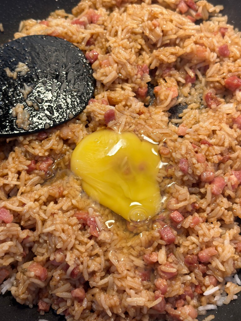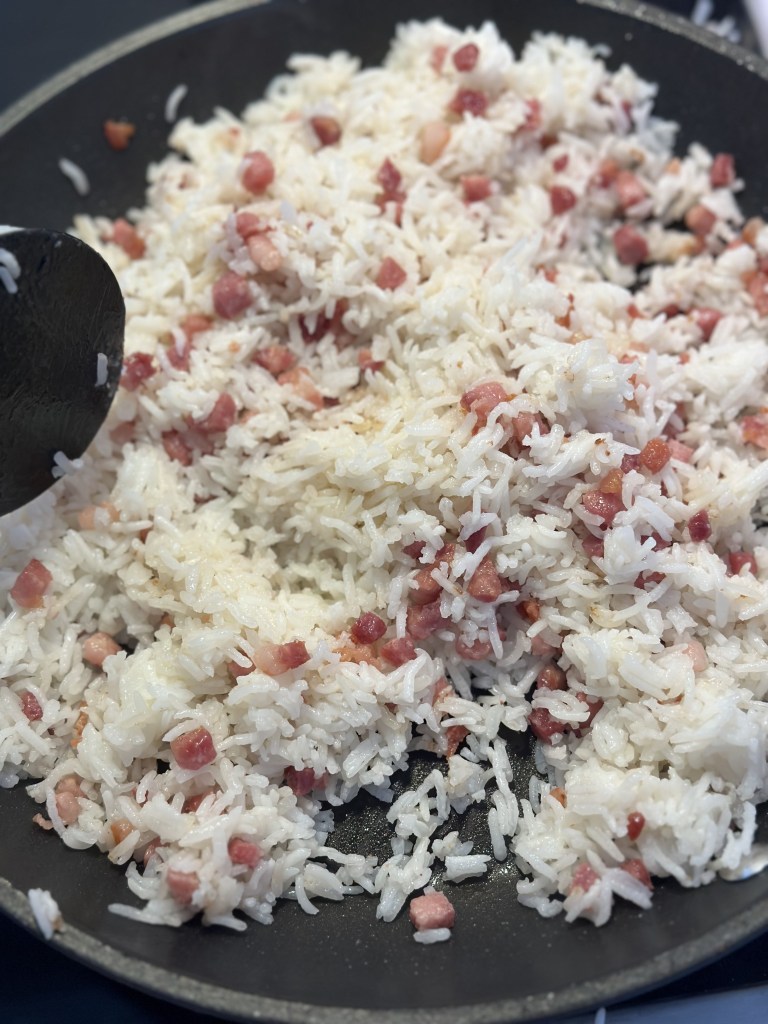 Steg først bacon sprøde. Herefter tilsættes ris, som steges sammen med bacon og i fedtet fra bacon. Alle de øvrige ingredienser (undtagen ægget) blandes til en marinade, og tilsættes. Steges godt sammen. Herefter tilsættes ægget som blandes godt i retten.