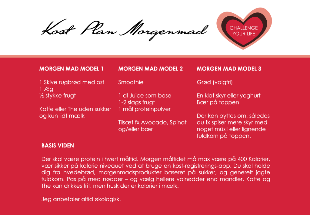 En kostplan som serveres overfor mange forskellige mennesker, vil være meget generel – og det er denne også. Men jeg er alligevel lykkes med at frembringe en model, hvor du kan bruge denne som et fundament, og lave tilretninger som passer til dig og din smag. Du kan tage til og trække fra, så længe du holder ding indenfor kalorie niveauet.