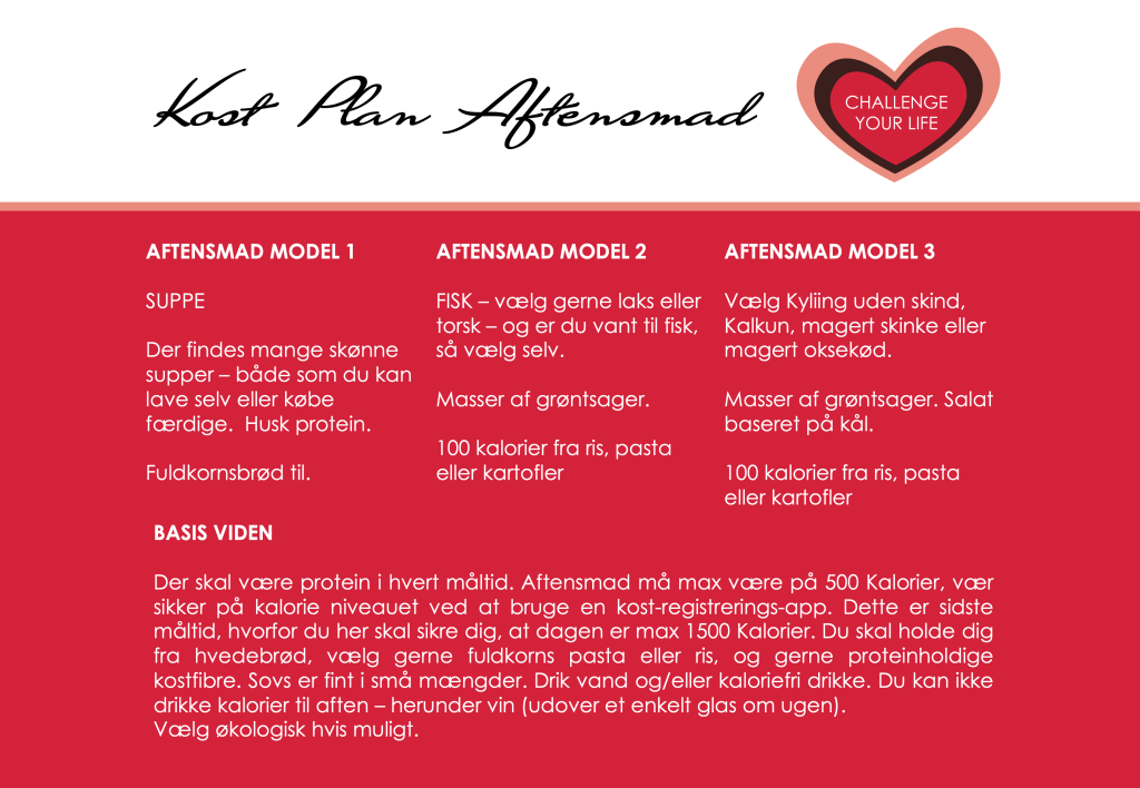 Du er nødt til at have styr på hvad du spiser. Kostplanen er tilpasset 1500 kalorier, men fx en skive rugbrød kan have alt fra 150 kalorier til 300 kalorier – alt efter indhold og tykkelse, så du må have din egen kontrol. Jeg anbefaler en kost registrerings appsom hedder Lifesum.