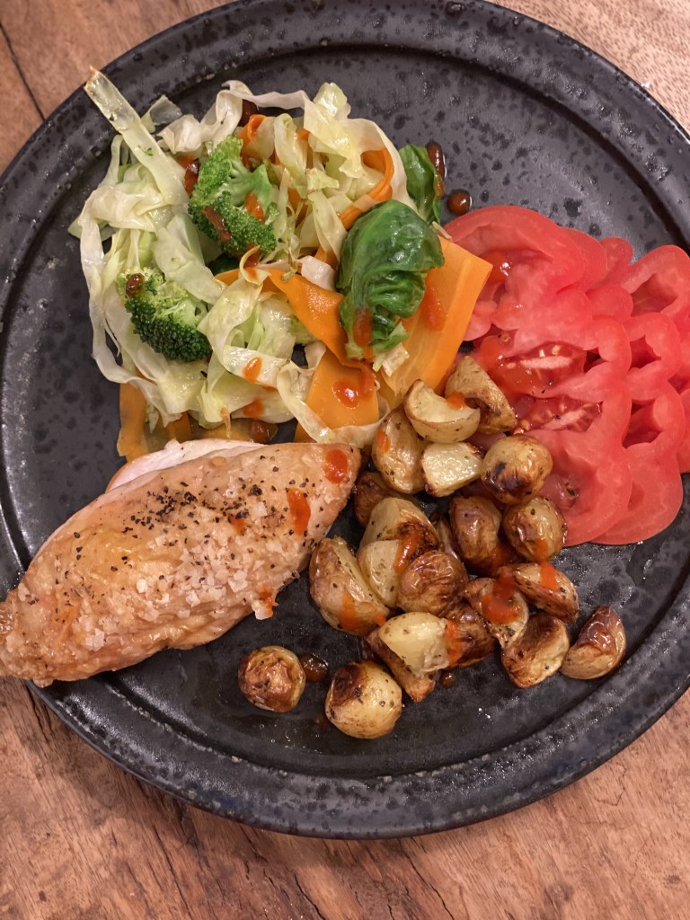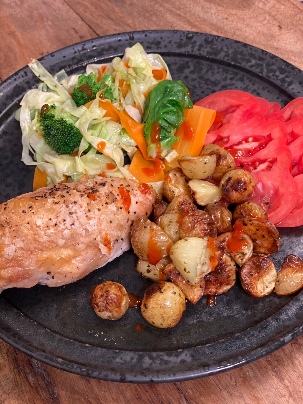 Kyllingen skal blot have godt med flage salt og peber. Og så i ovnen ved 200 grader i ca. 20 minutter. Så kyllingen skal have ca. 5 min. mindre end kartoflerne, men det er perfekt, så kan kødet lige hvile lidt. Når du præsentere det på din tallerken, så kan du vælge at skære i stykker eller servere et helt stykke.