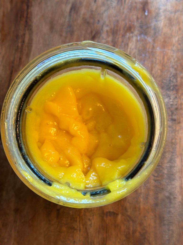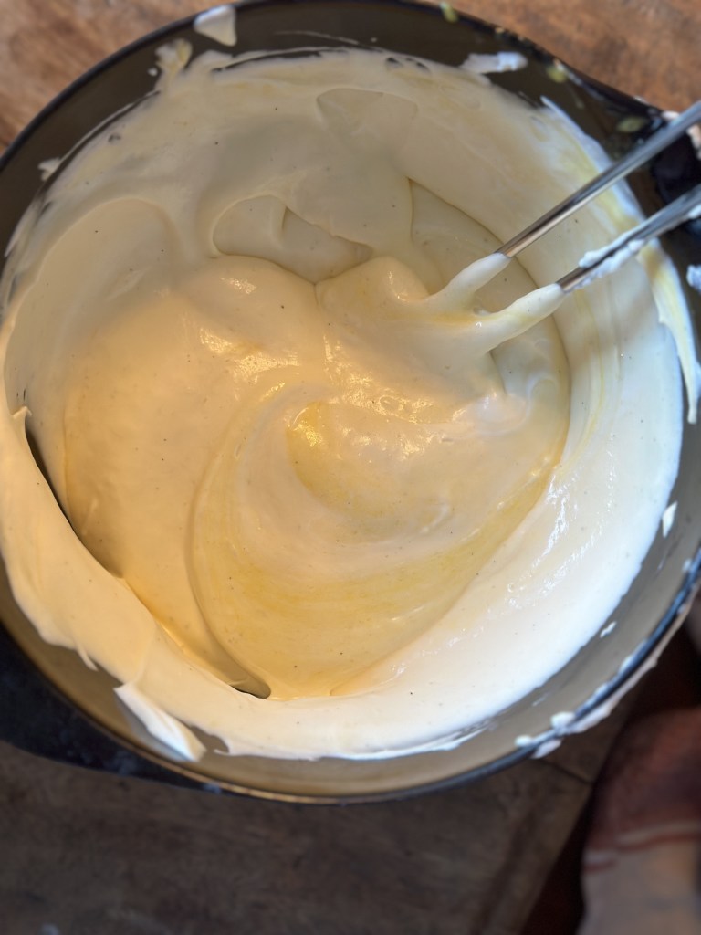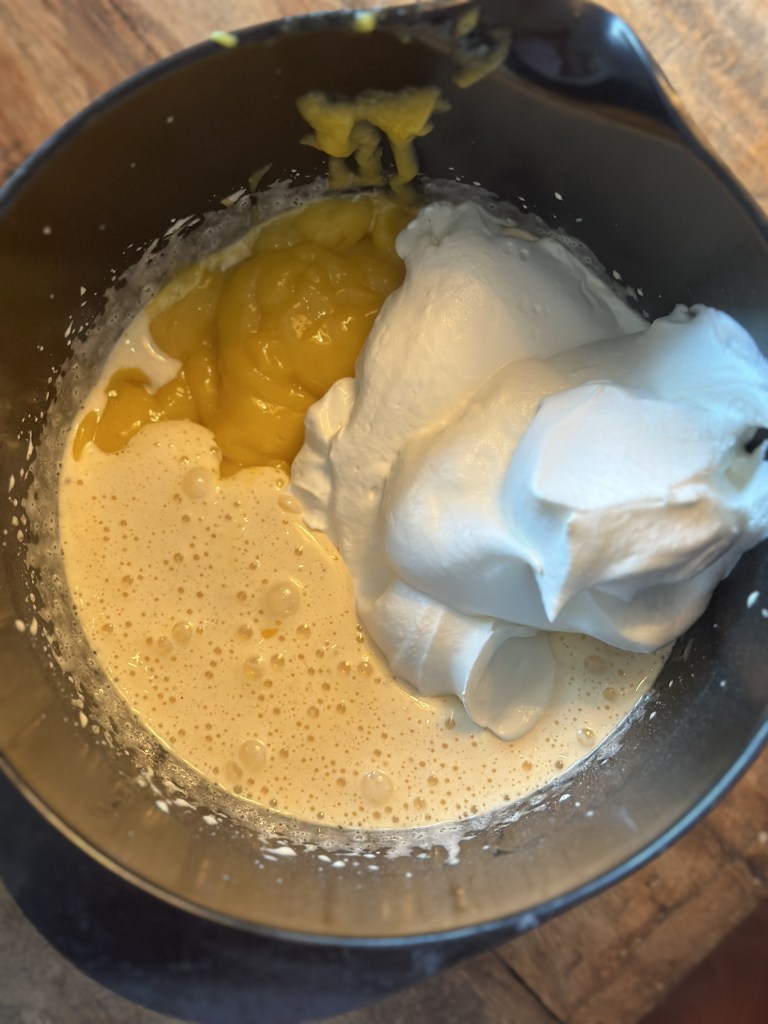 Pisk pasteuriserede æg blommer med rørsukkeret til det er stift og cremet. Pisk en anden skål den laktosefri piskefløde til niveauet lige inden flødeskum – tilsæt græskinspireret laktosefri yoghurt og saftens fra 1 citron (husk at fjerne kernerne). Blend mangoen godt, således de bliver cremet. Vend alle ingredienserne i den skål.