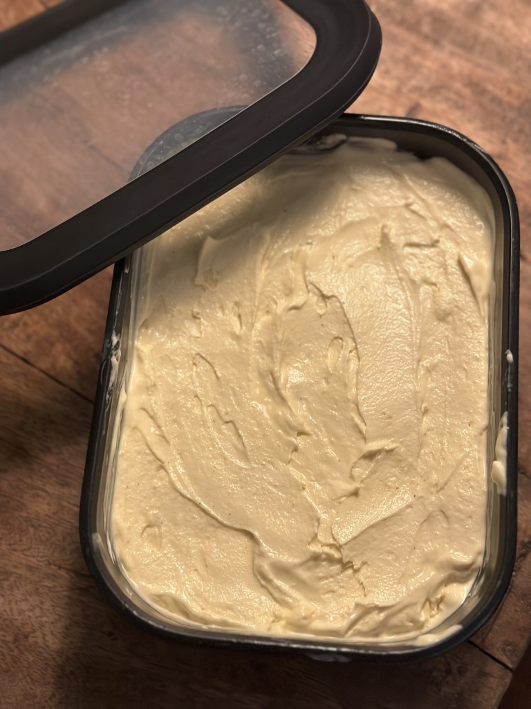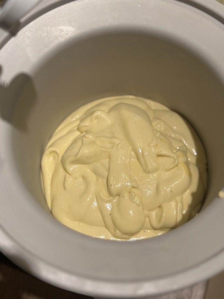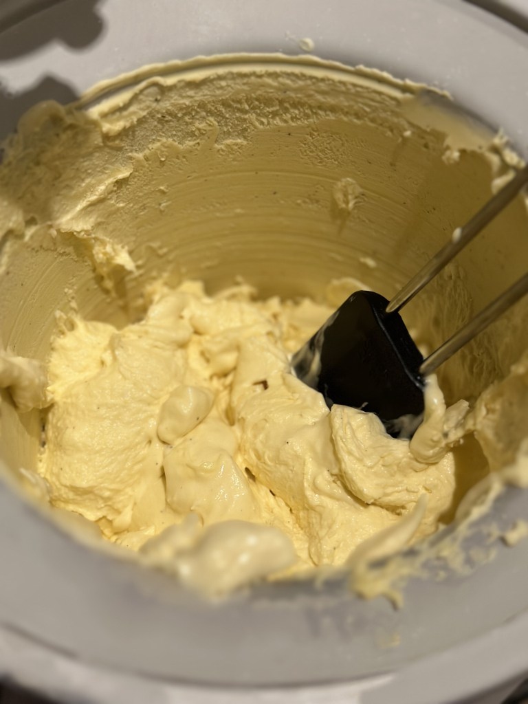 Jeg bruger en ismaskine, men du kan også lægge massen på frys og efter 2 timer piske den kolde masse igennem igen, og derefter på frys til den er klar.