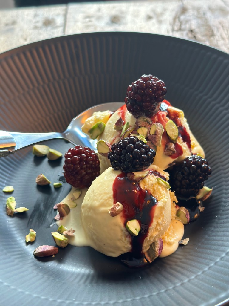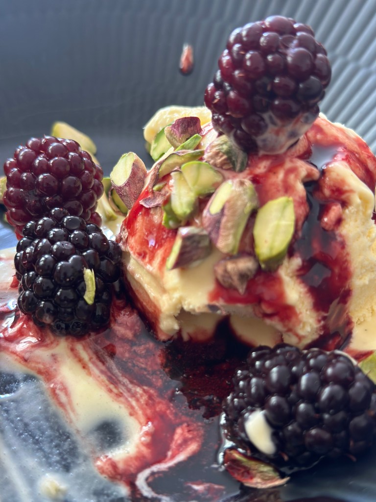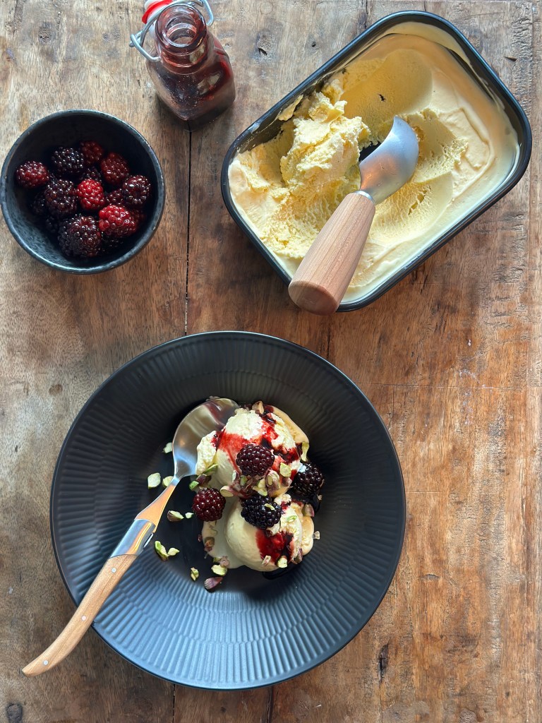 Jeg opløser sukkeret i rommen, og dækker herefter brombær med blandingen. Lader den stå et par dage – ikke nødvendigvis på køl, men under lukket låg. Væden tager jeg fra og koger op, sammen med saften fra en frisk citron. Jeg koger blandingen ned til sirup. Jeg bruger siruppen sammen med brombær og serverer isen med hakkede pistacie nødder.