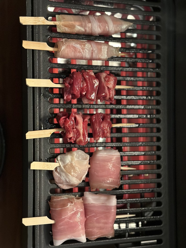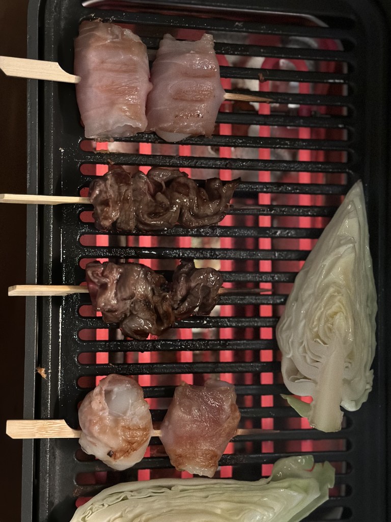 Alle sticks er monteret på et mini bambusspyd og smurt med risolie. Grillet på en morsø el grill med støbejernsrist. Den originale japanske grille er også aflang, men den bruger kul. I Japan er der mange restauranter, hvor man laver disse sticks ved bordet på restauranten.