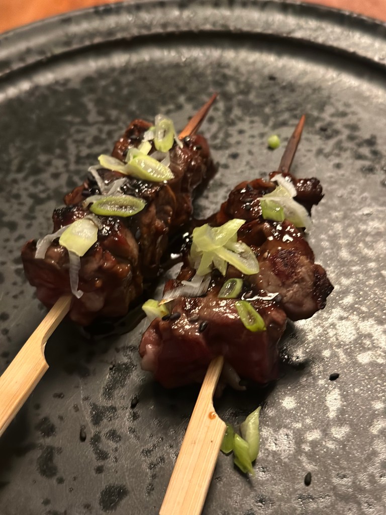 Her er det blot en ripeye som er skåret i tynde skiver og monteret et stick. Den er vendt i Teriyaki sauce og risolie. Serveret med Tare sauce og frisk forårsløg. Se min opskrift på Teriyaki sauce her !