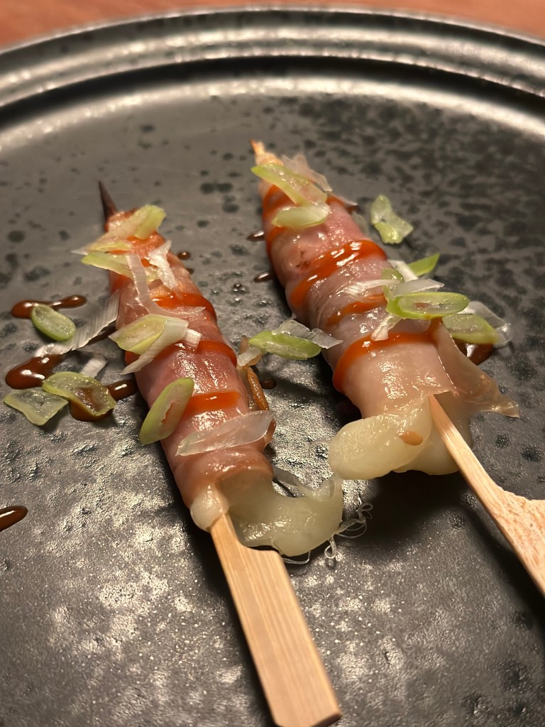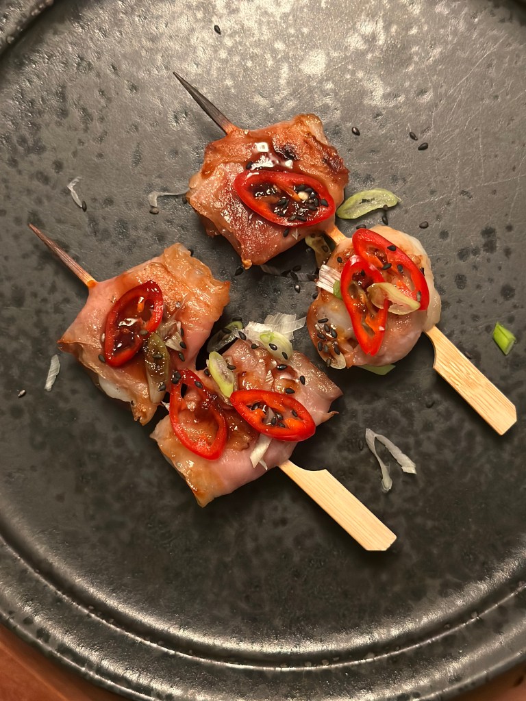 Japanske kammuslinger som pakkes i Skagen Skinke. Serveret med Tare sauce, frisk chili og frisk forårsløg.