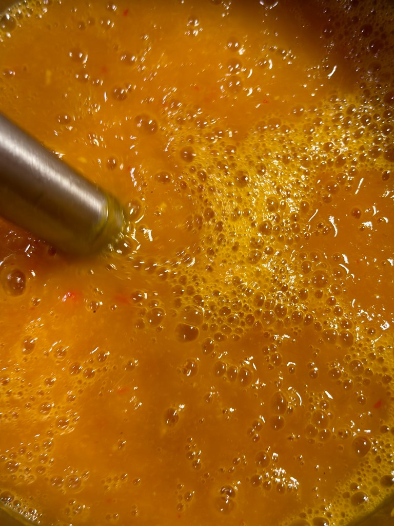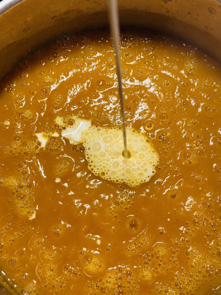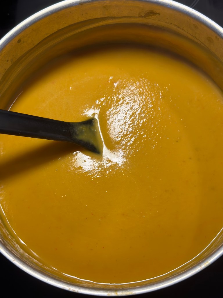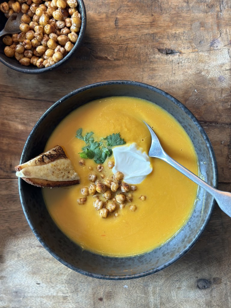 Den er toppet med en klat laktosefri creme fraiche, ristede kikærter (udblødte og ristes i smør, cayenne og spidskommen) og koriander.Som tilbehør brød som er gratineret med Vesterhavsost.