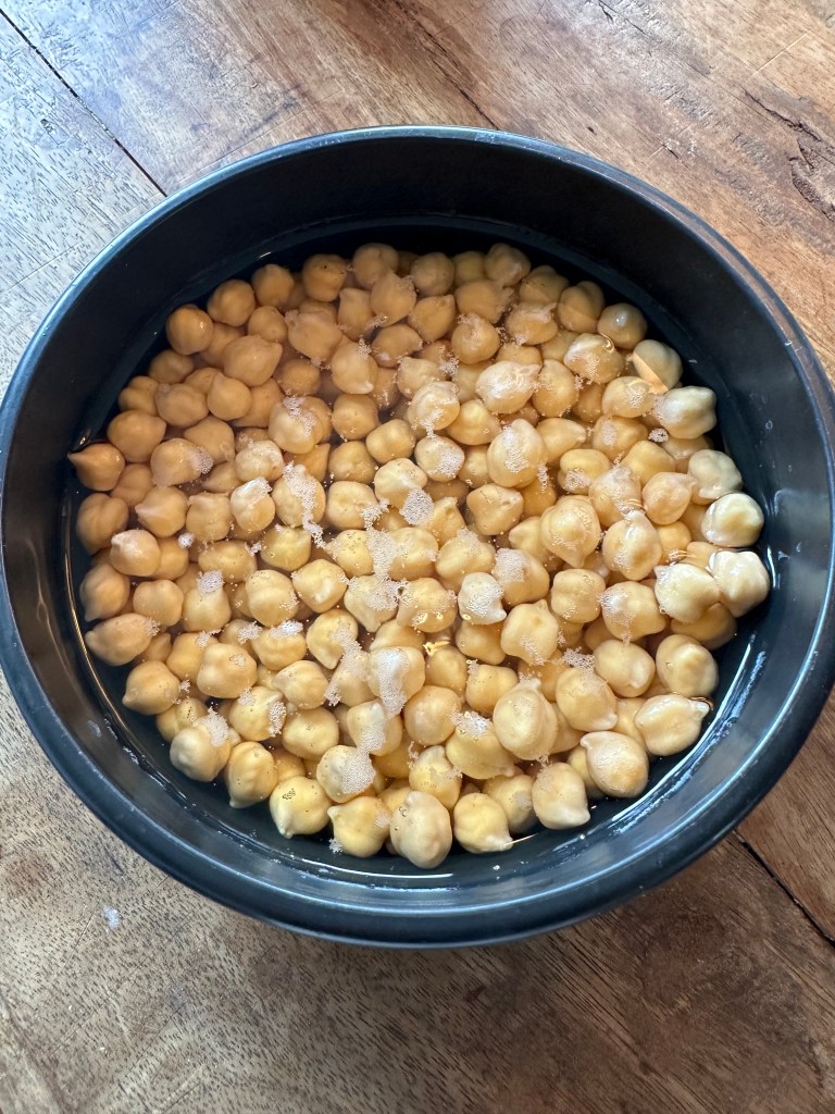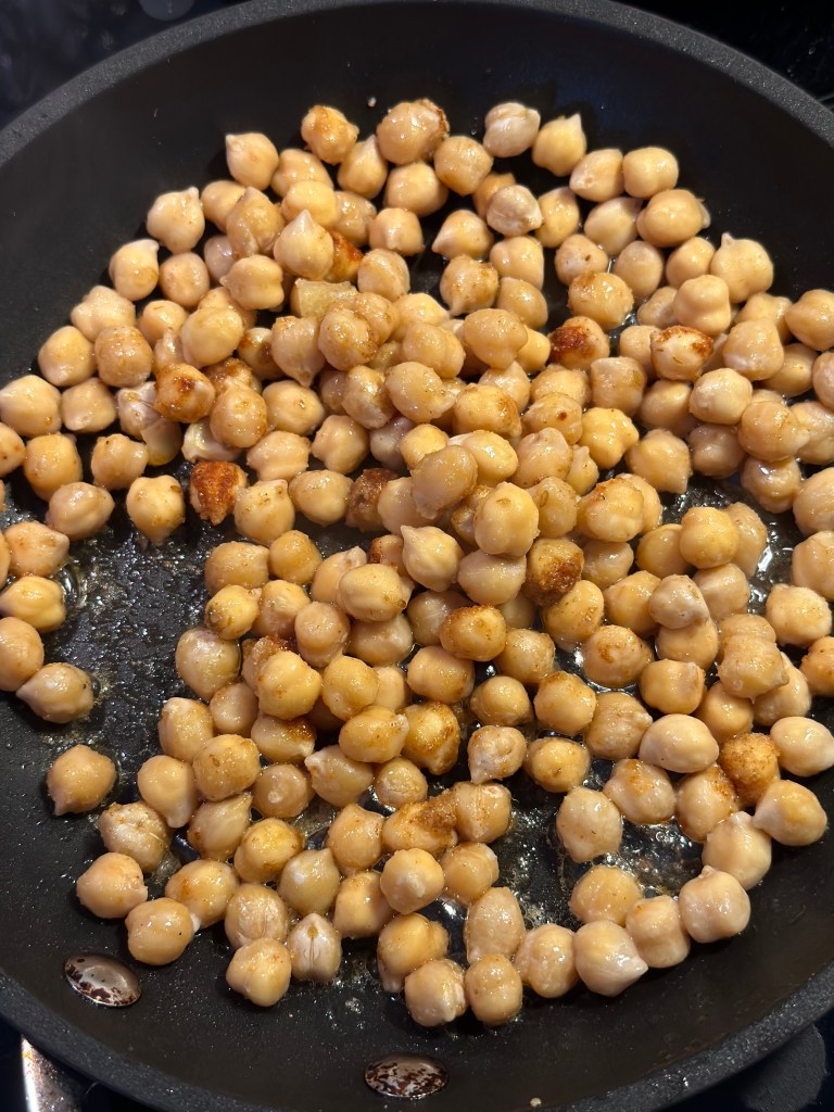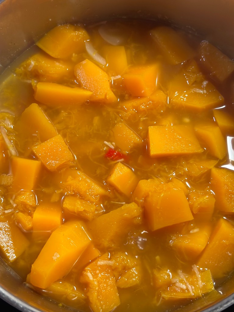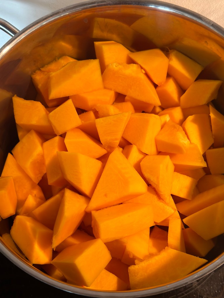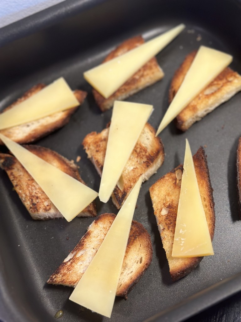 Den er toppet med en klat laktosefri creme fraiche, ristede kikærter (udblødte og ristes i smør, cayenne og spidskommen) og koriander.Som tilbehør brød som er gratineret med Vesterhavsost.