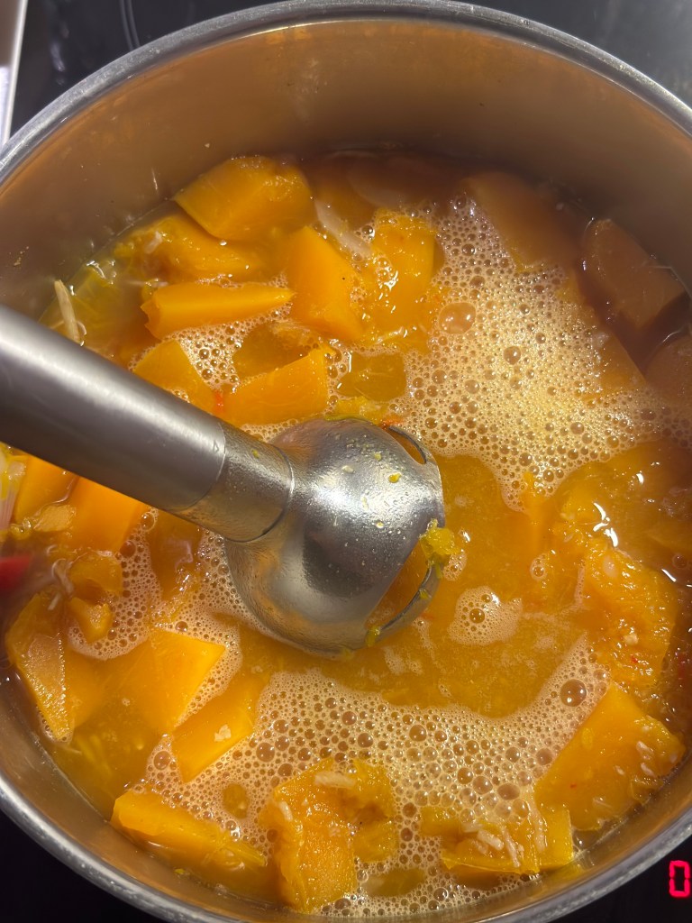 Skær Hokkaido i mindre stykker. Koger det hele sammen (uden fløde) og når Hokkaido er helt mør, tager du citrongræsset op, og blender suppen jævn. Tilsæt fløden og smag til med salt og peber – kog det hele op, og that´s it.