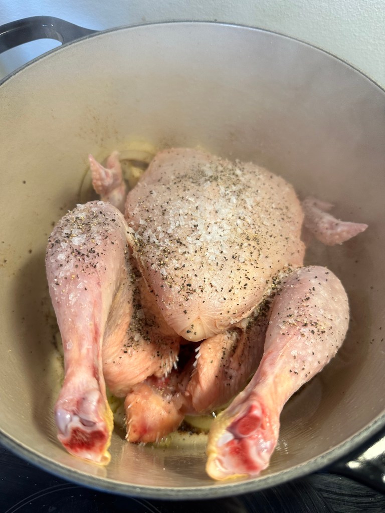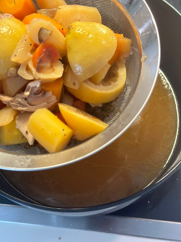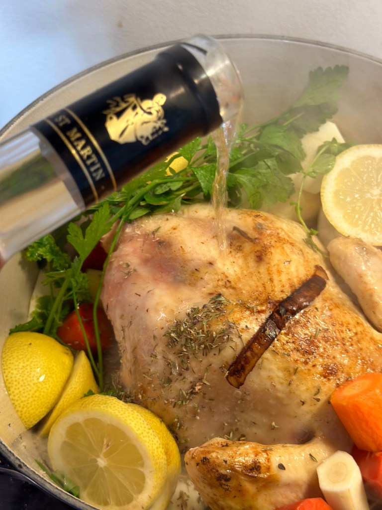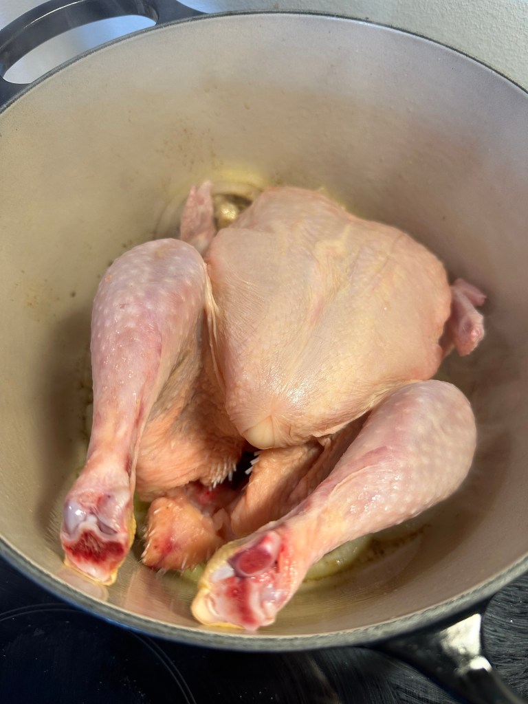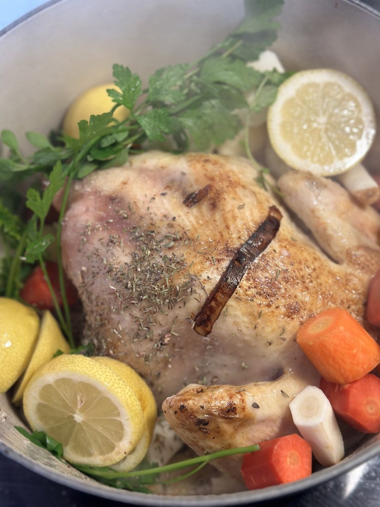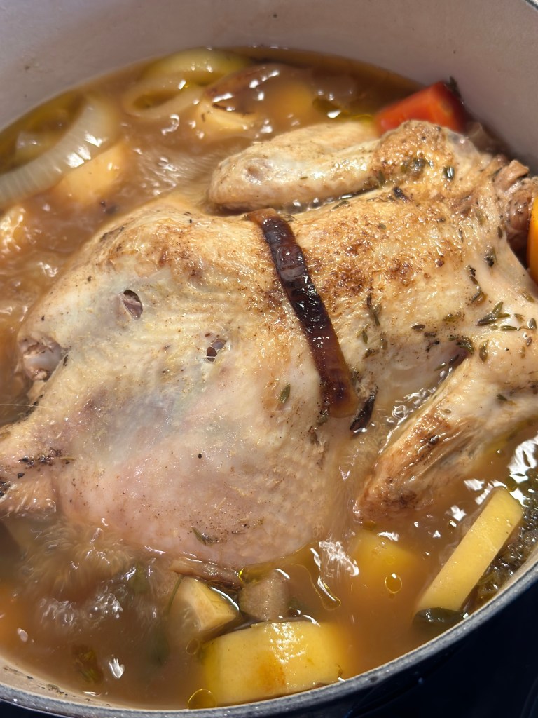 Brun hønen i smør på begge sider sammen med løg og hvidløg. Tilsæt vand og de øvrige grøntsager. Tilsæt vinen og krydderurterne. Lad det hele simre i 1 times tid, og lad det gerne stå lidt. Tag kyllingen op og sig grøntsagerne fra.