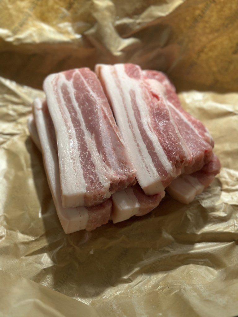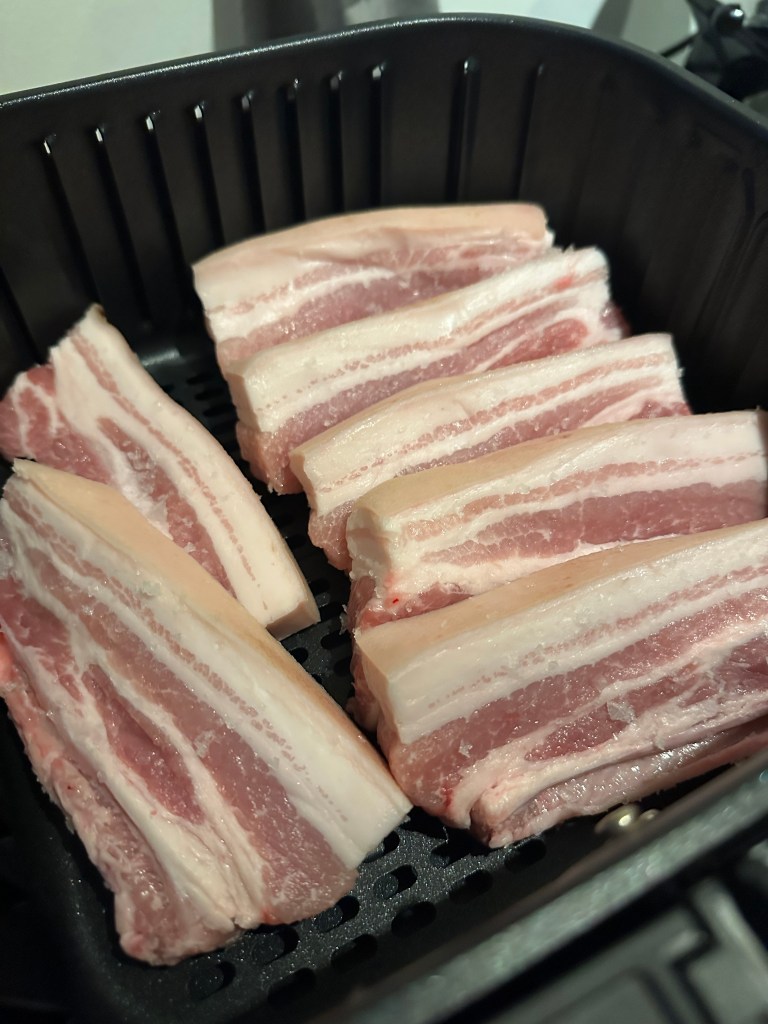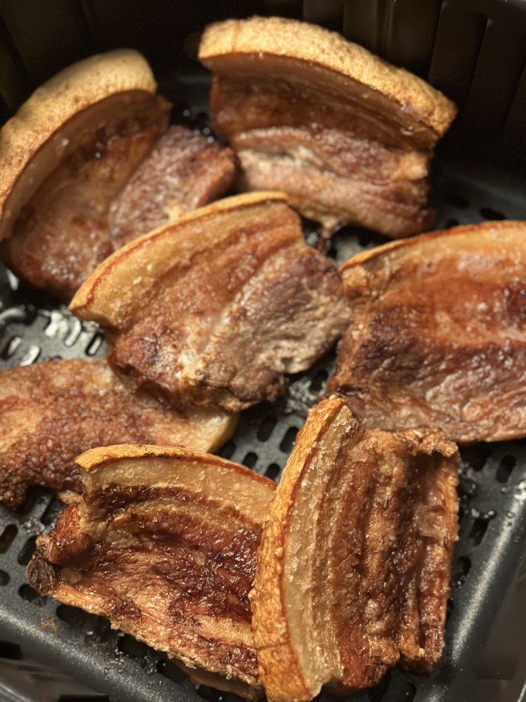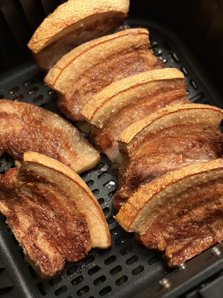 Det fungerer overraskende godt med stegt flæsk i en airfryer. Jeg har dennne gang valgt lidt tykkere skiver fra slagteren, fordi de så bliver lidt mere juicy end tørre. Og der virkede så godt.