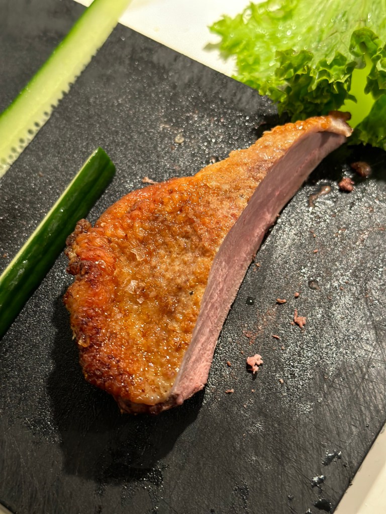 Andebrystet er lavet i en airfryer – 15 minutter ved 200 grader til en kernetemperatur på 60 grader. Således er det fint rosenrødt.