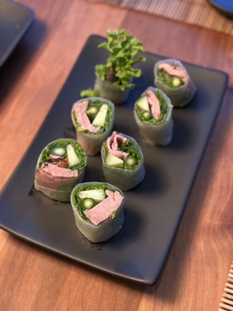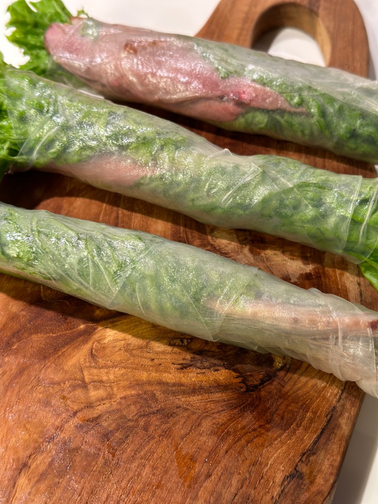 Rispapiret dyppes i lunkent vand (ikke fra hanen, men opvarmet koldt vand). Pas på, de bliver meget klisteret. Læg dit fyld i hele længden på tværs i midten. Rul den ene side rundt om, og pres til – rul resten af papiret rundt. Jeg gentager gerne med to yderligere stykker, for at presse det bedst muligt og sikre det holdes på plads når jeg skærer dem i mundrette stykker som sushi.