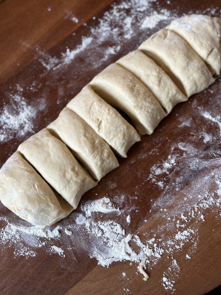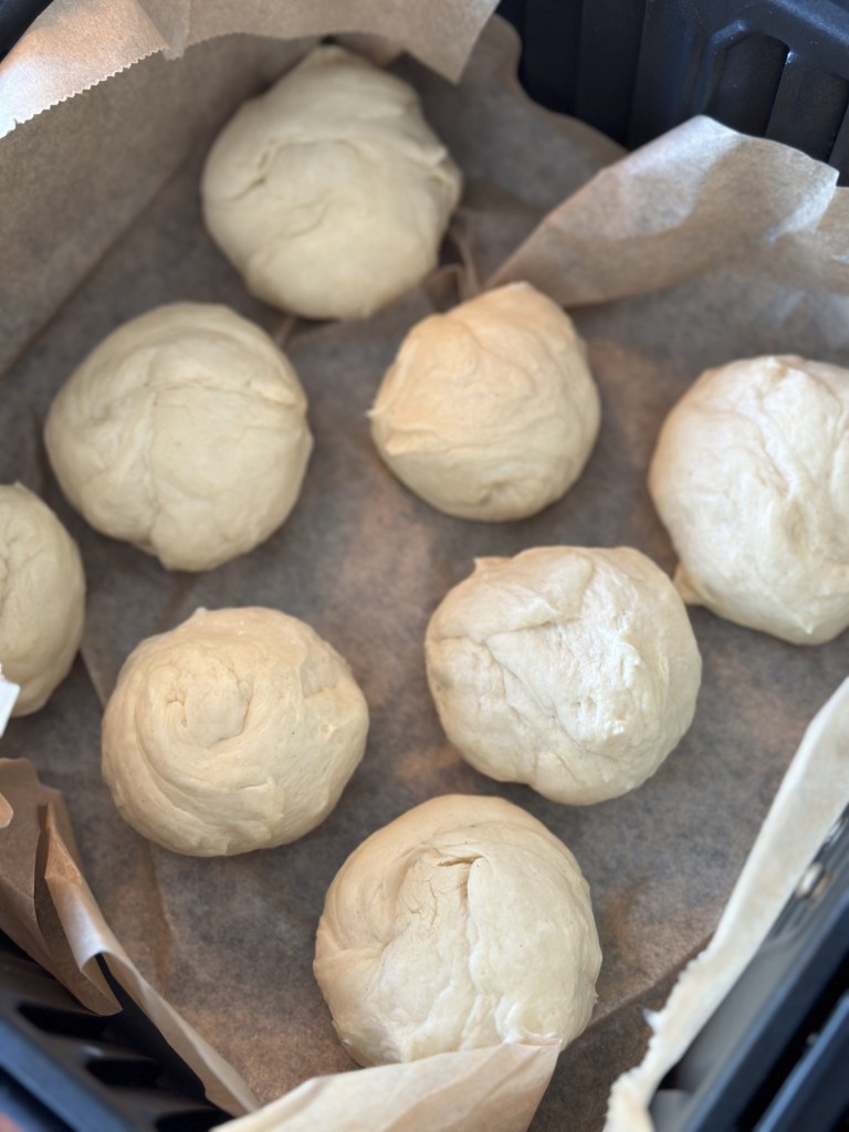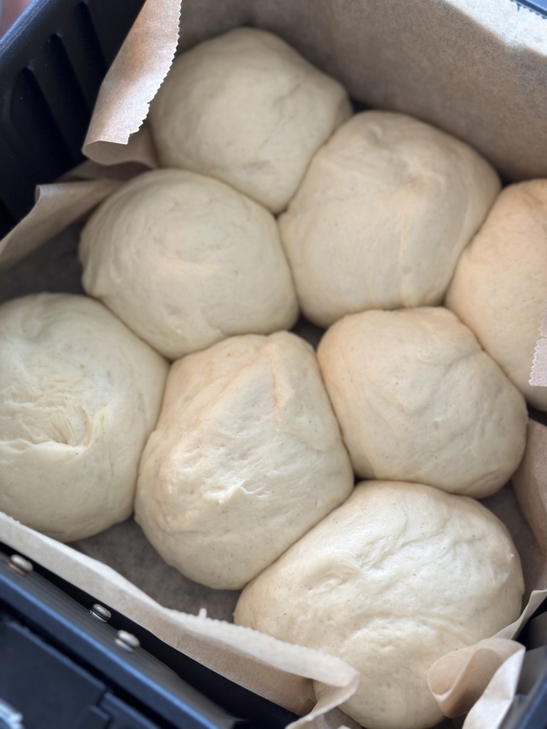 Jeg hæver ikke to gange (skulle måske), men deler i 16 boller med det samme og lægger i en smurt form – god plads i mellem, for de hæver for vildt på blot halvanden time.