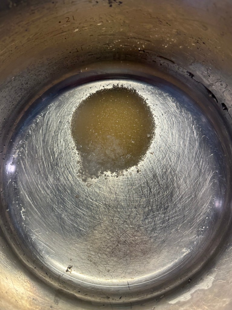 Hældes i en kasserolle og bringes i kog indtil salt og suller er op løst. Blandingen hældes til risene. og fordeles indtil risene har optaget blandingen.