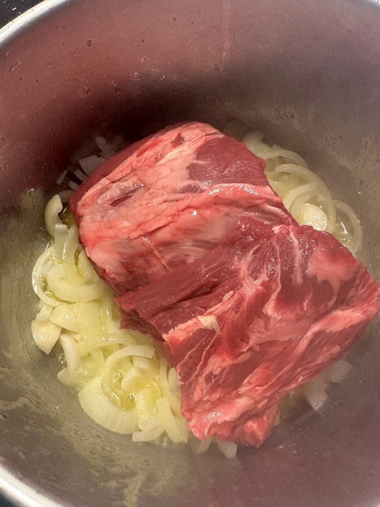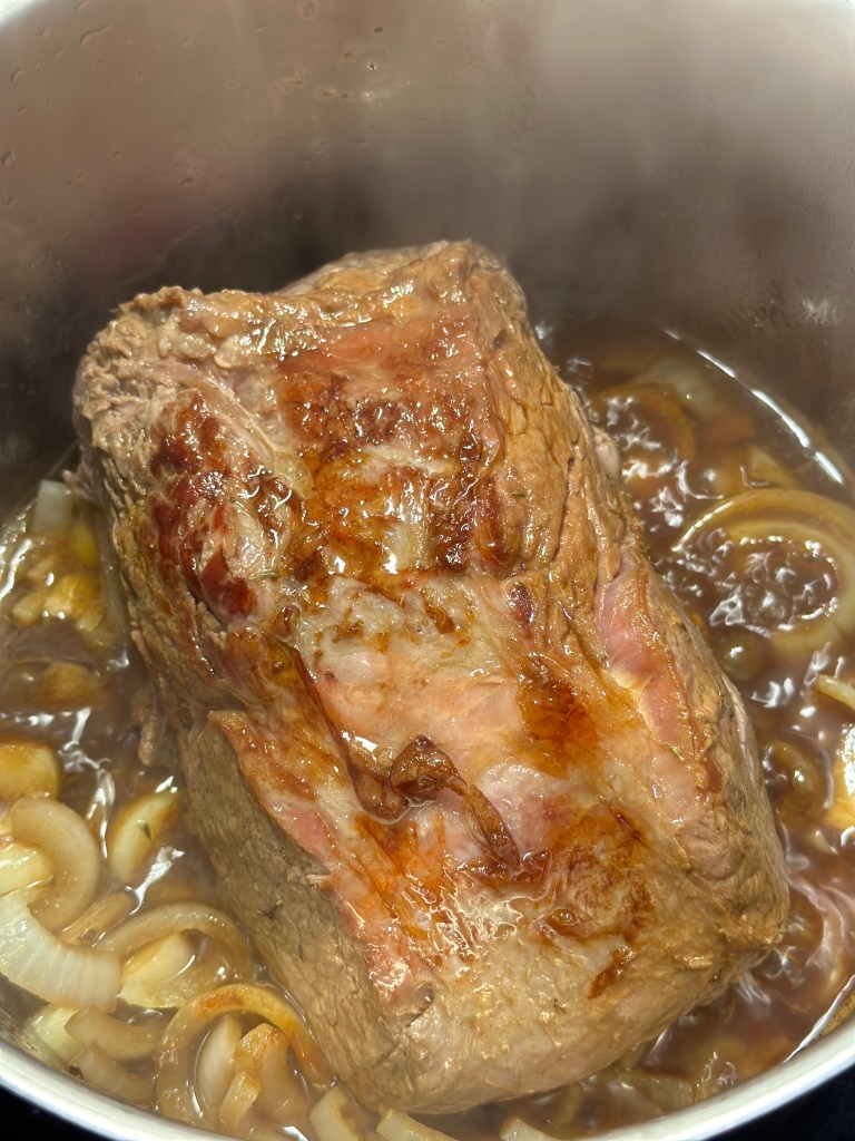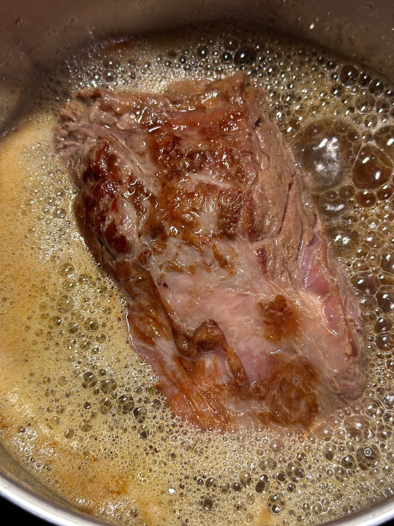 Tag en tykbundet gryde som passer til din størrelse steg. Smelt smørret og lav det lige få farve. Sauter løg og hvidløg i smøret. Når de begynder at få lidt farve, lægger du stegen i. Brun stegen på alle sider – arbejd med den har 4 sider. Tilsæt danskvand og herefter de øvrige ingredienser. En steg skal have salt, men da der også er soya i, skal den ikke have for meget. Væden skal dække stegen 2/3 og ellers tilsætter du mere dansk vand. For mere dybde i smagen, kan du vælge 50% danskvand og 50% vin eller øl.