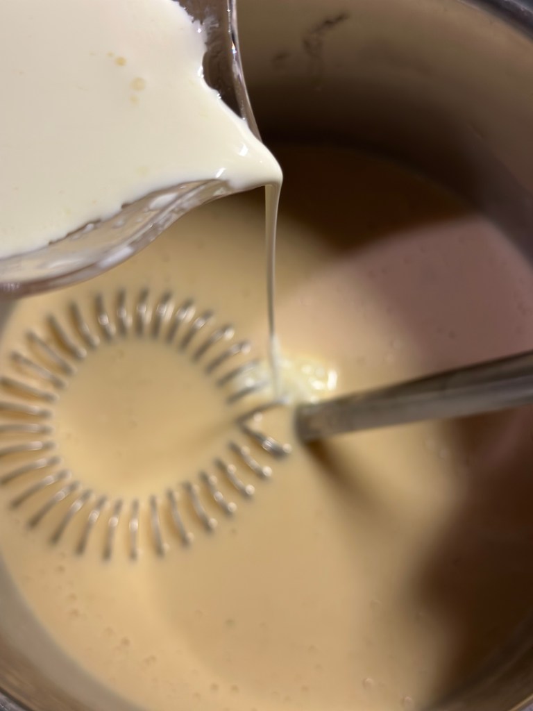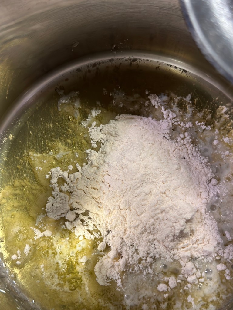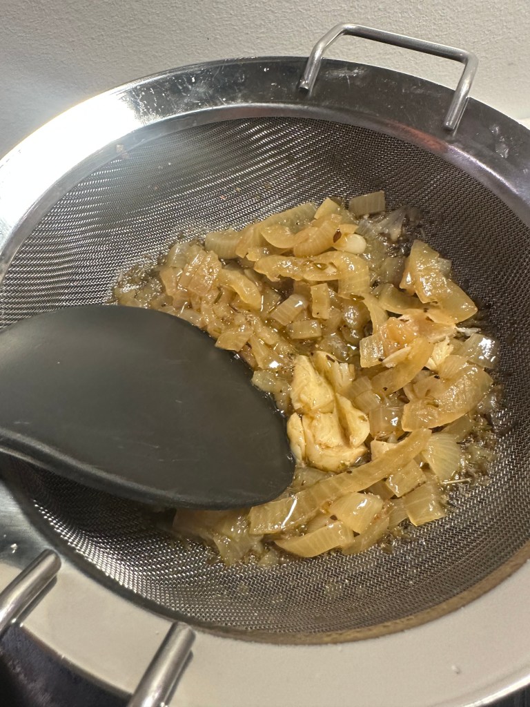 Når stegen er færdig, tager du den op. Væden som er tilbage er basis fond, og den skal lige igennem en si for at fjerne løg og øvrige rester som vi ikke vil have med. Du skal bruge 2,5 dl fond og resten kan gemmes til en anden gang du har brug for oksekødfond – den kan også fryses ned.