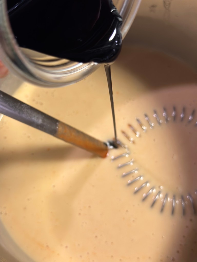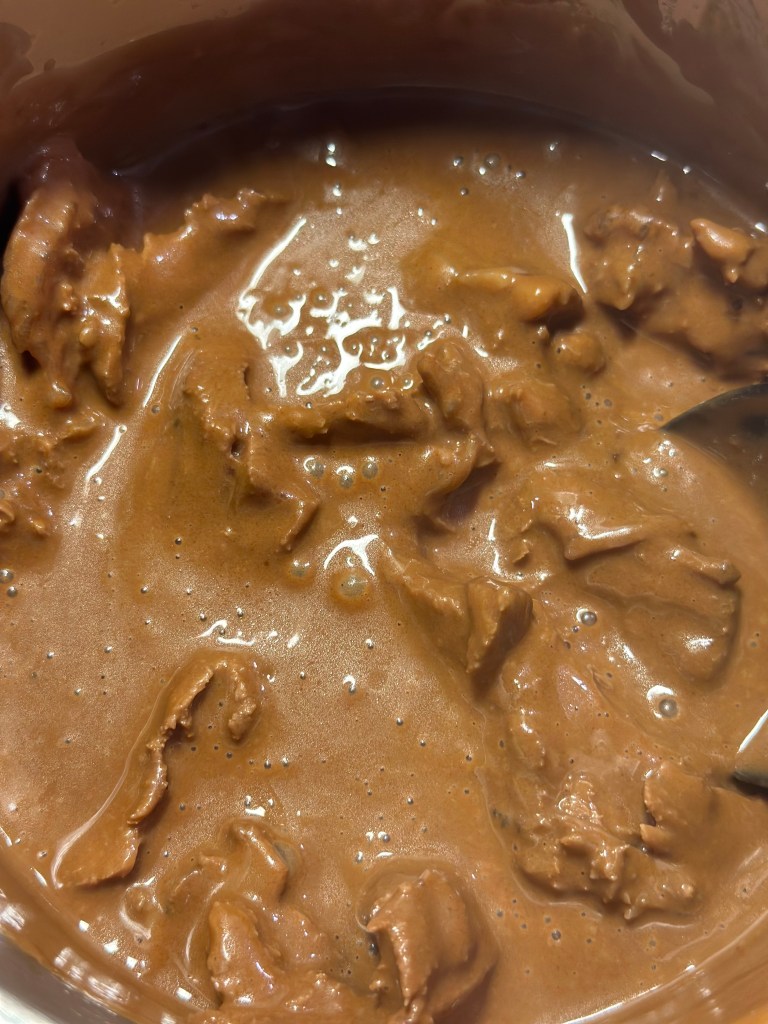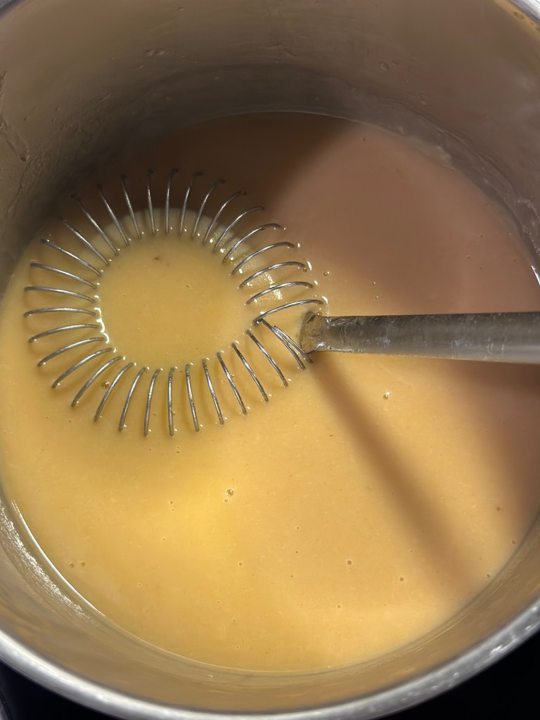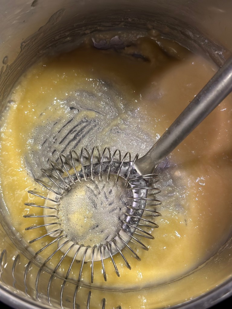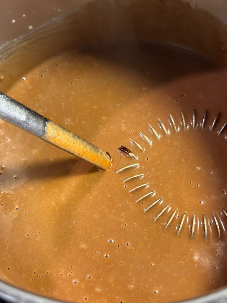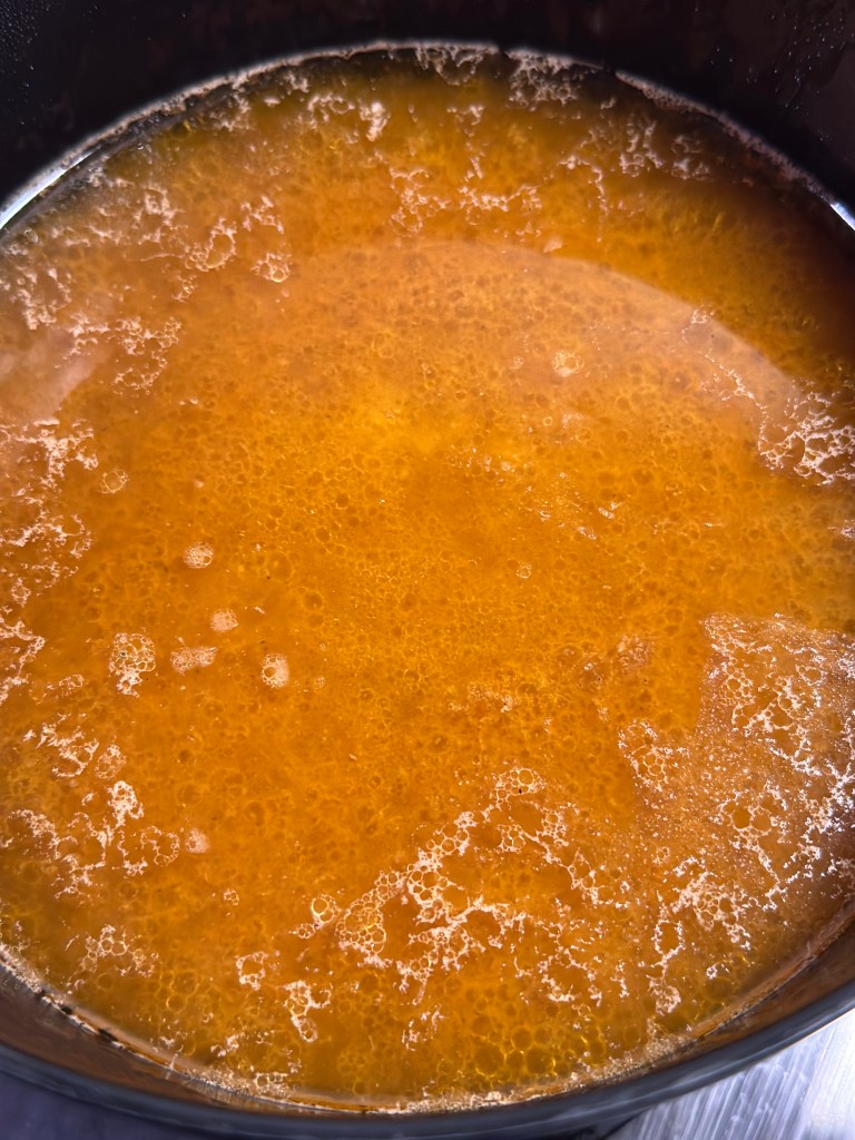 Den skal herefter simre i mindst 2 timer ved svag varme – kun lige boble.