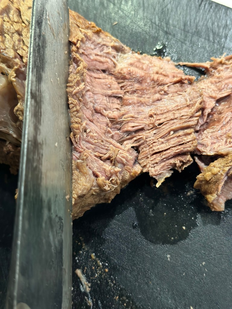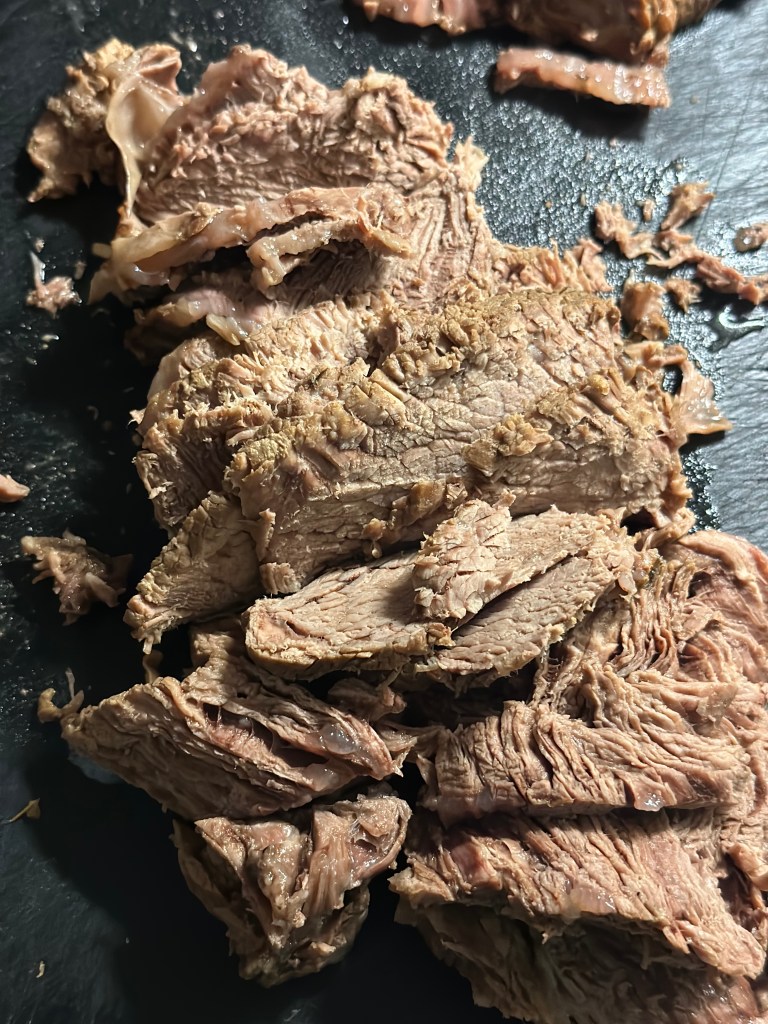 Du kan enten lave kødet til puller beef ved at rive det fra hinanden, eller du kan skære det i meget tynde skiver. Herefter lægger du kødet i saucen og varmer op.