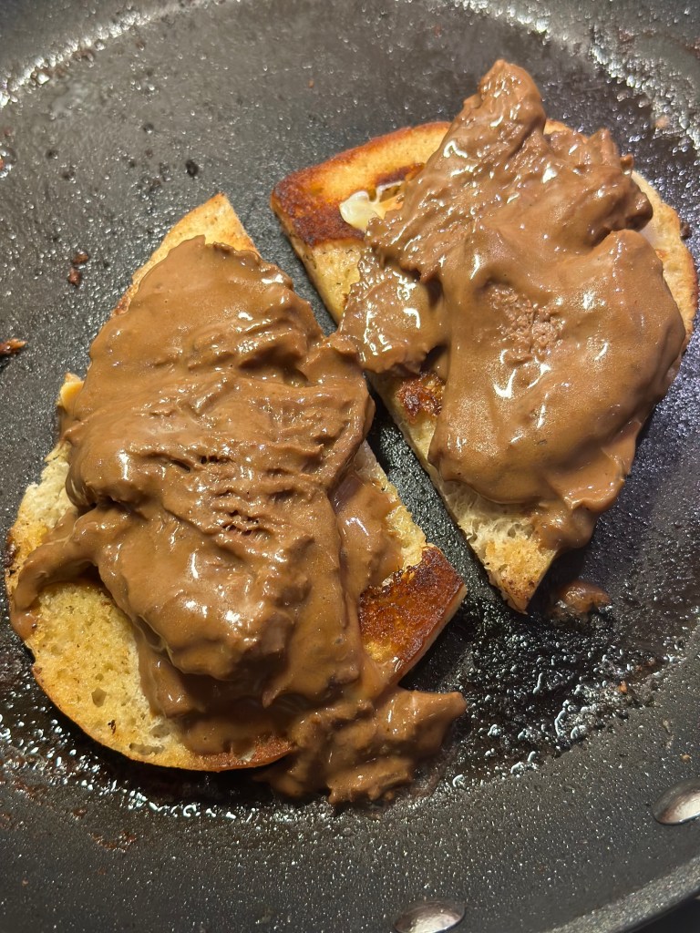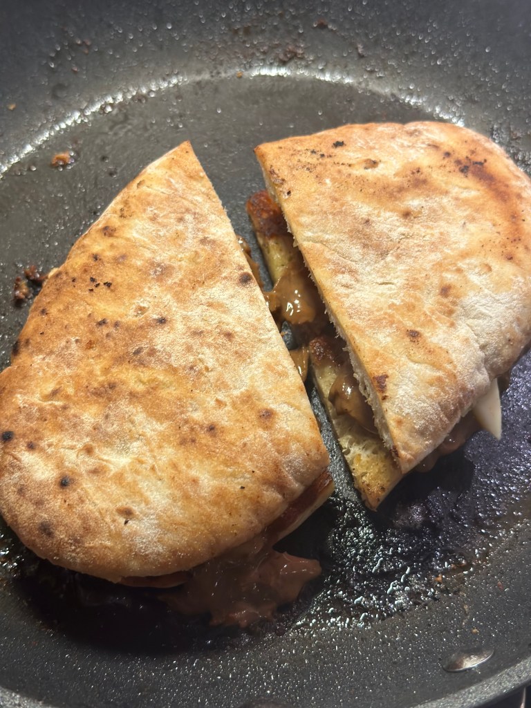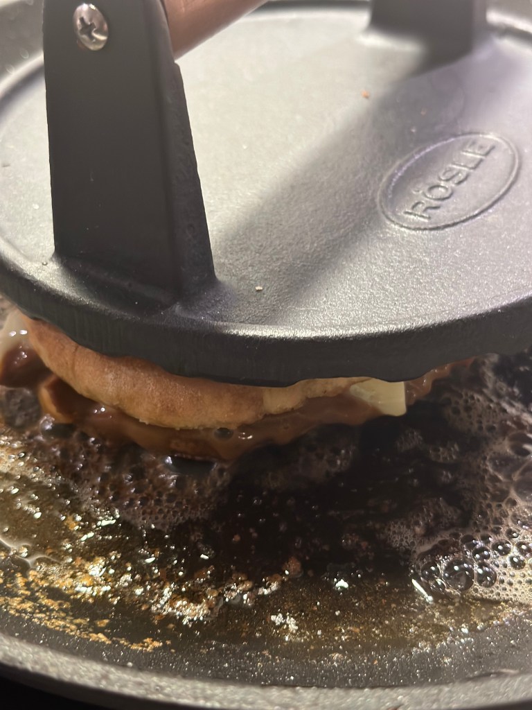 Brødet rister jeg på panden i lidt smør. Når det vendes, bygger jeg sandwichen op med den ene side brød i bunden, en skive ost, kød med sauce, ost og brød igen. Jeg bruger en opvarmet bøfpresse til at holde den ned, men du kan klare dig uden. Osten skal smelte før den er klar.