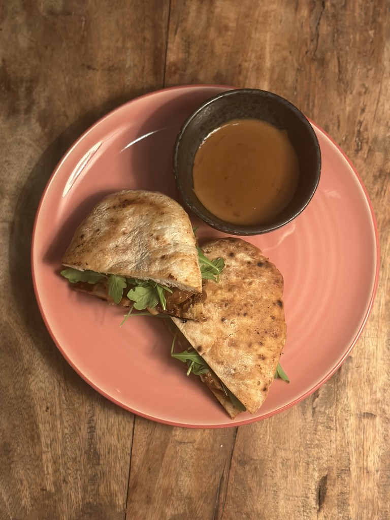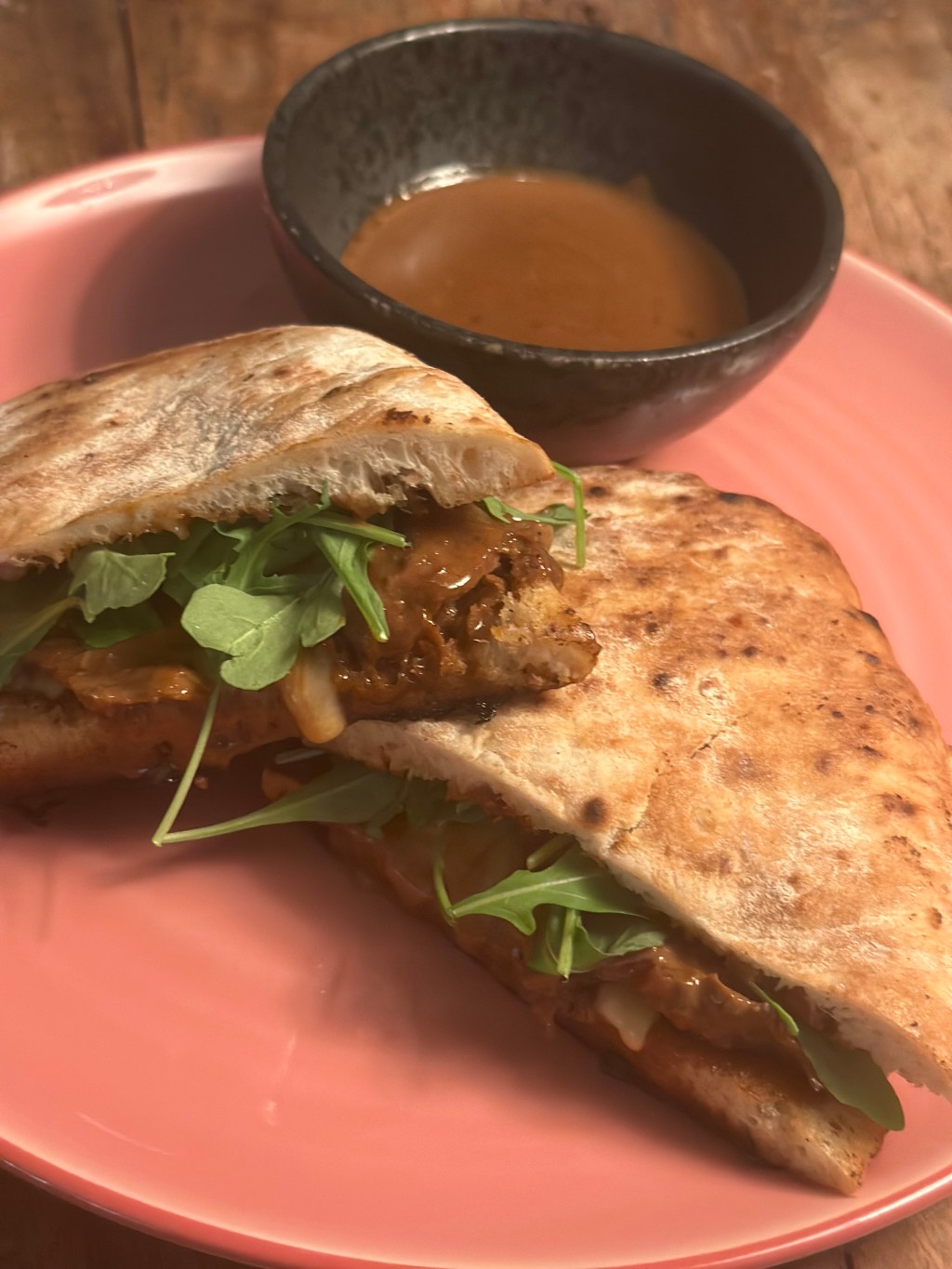 Serveres med sauce på siden, som man dypper sandwichen i.