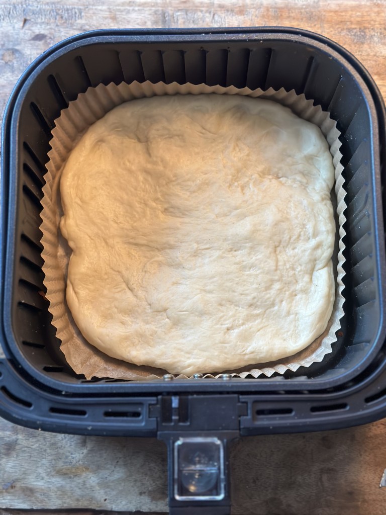 Når dejen har hævet første del, slås den ud til den er jævn flad i en bradepande. Her hæver den 30 minutter yderligere, og herefter bruger du dine fingre til at lave huller i dejen – jævnt fordelt.