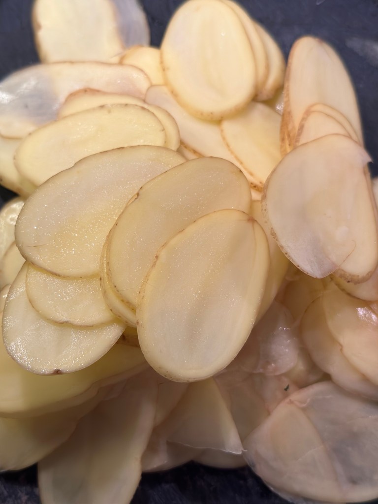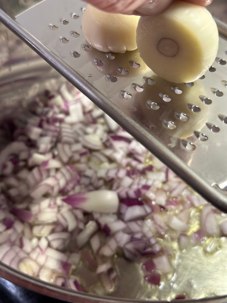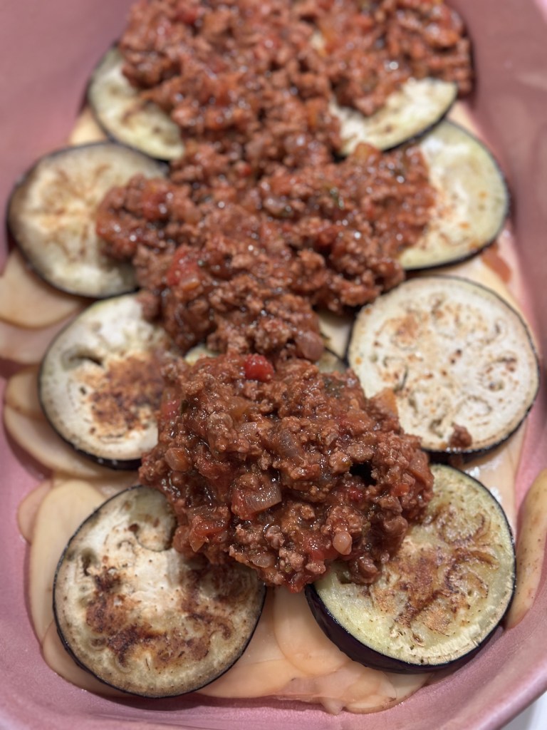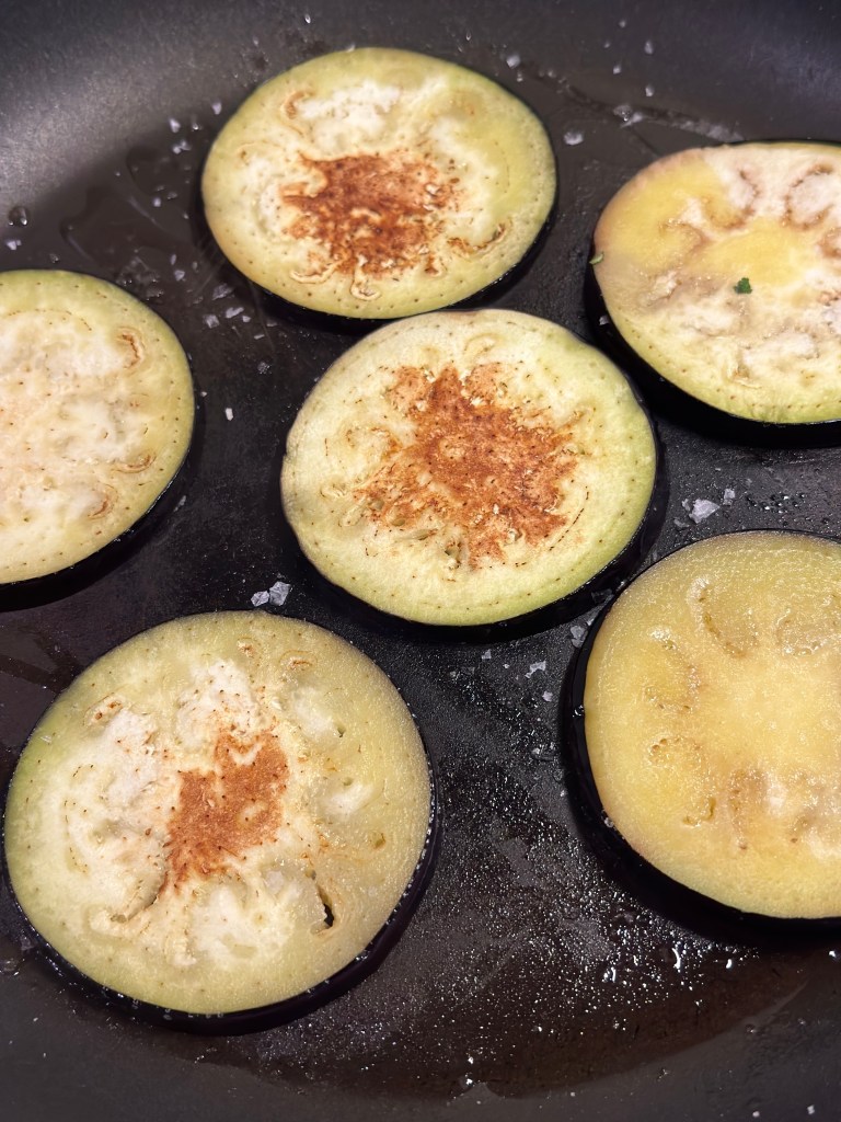 Kartoflerne som er rå skal fint rives. Auberginerne skæres i 1 cm skiver og ristes på panden i olivenolie og krydres med salt.