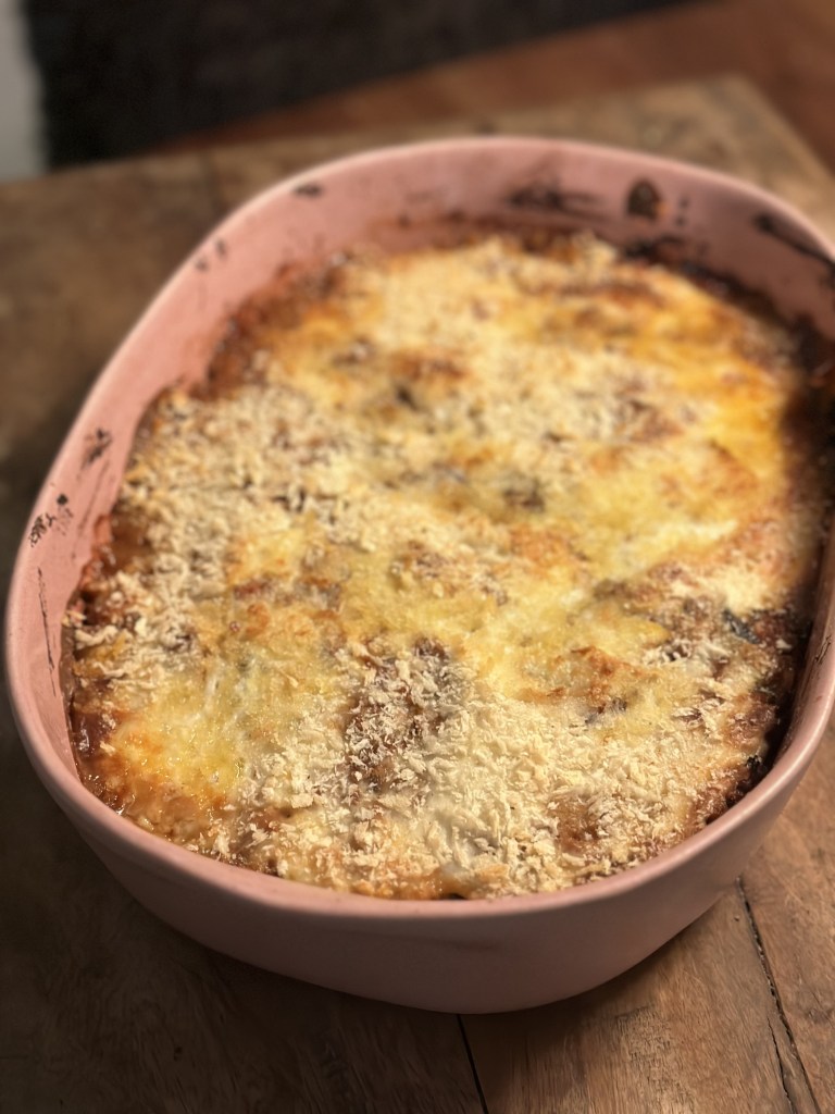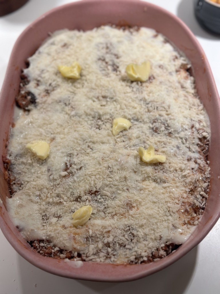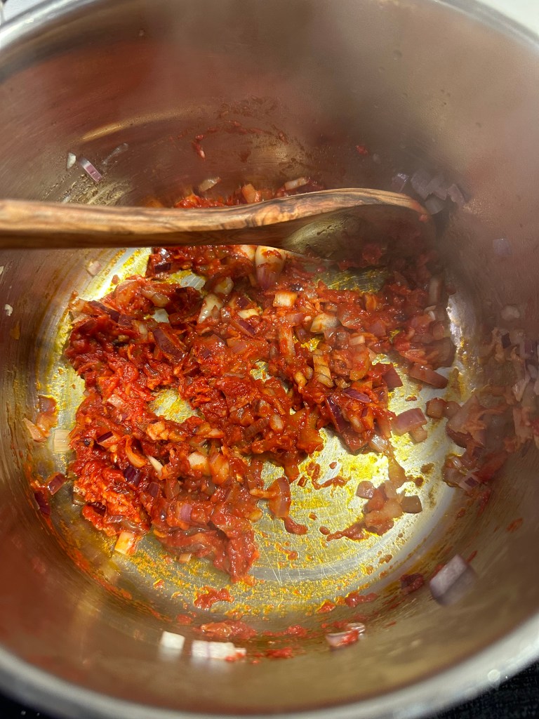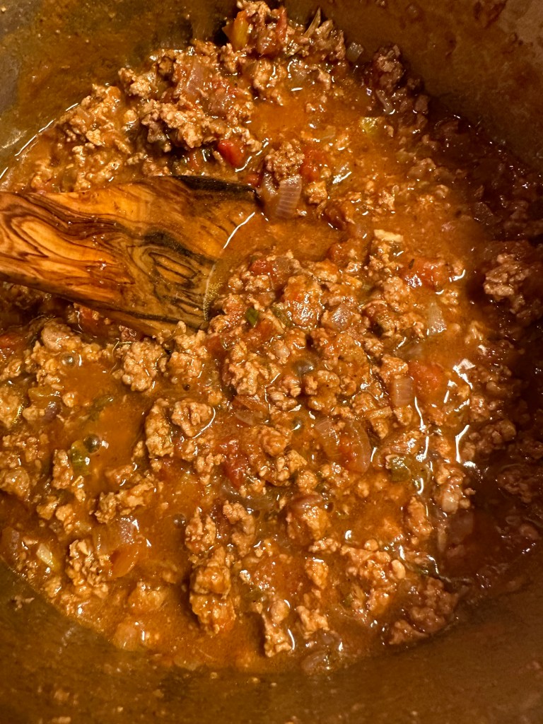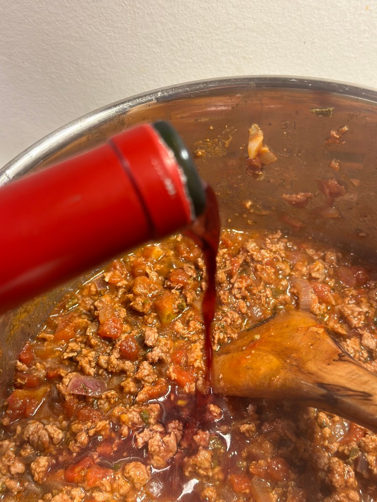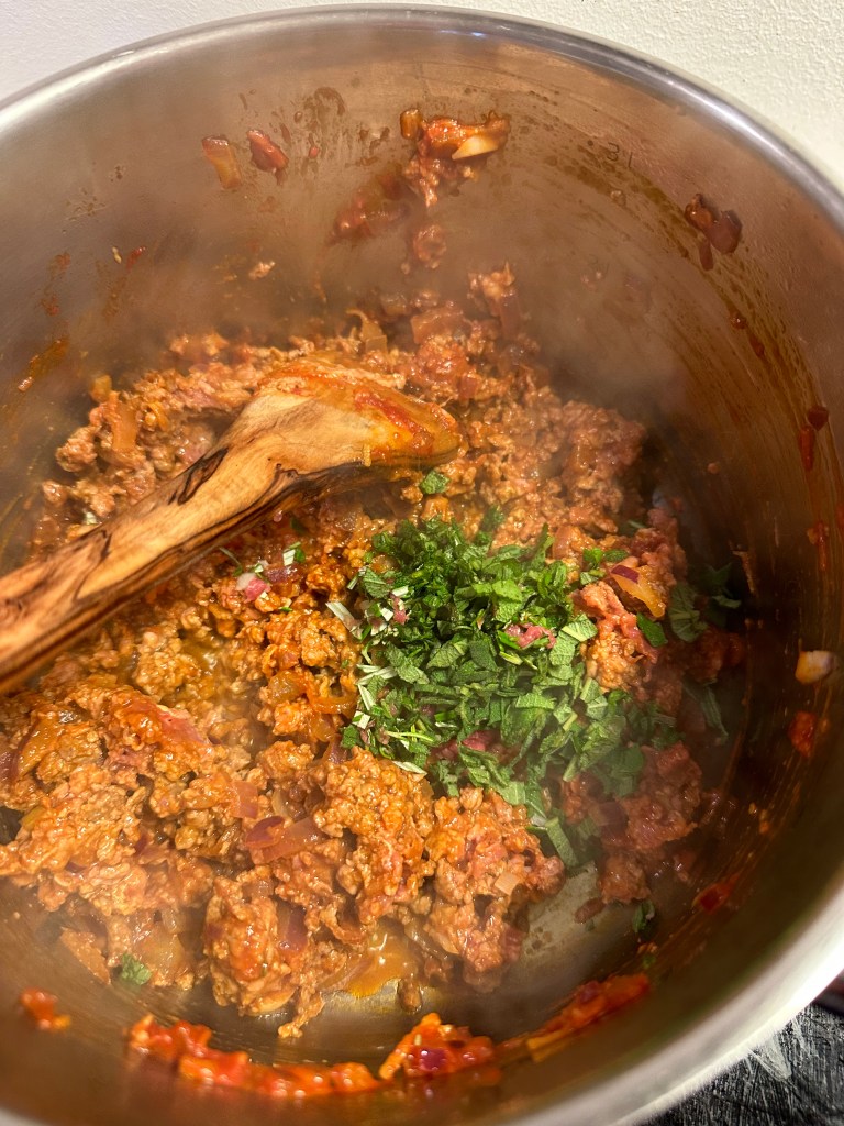 Start med at sautere løg og hvidløg i olivenolie. Tilsæt tomatpure og lad det arbejde sammen. Tilsæt kødet (som jeg selv har hakket), sammen med fintsnittet krydderurter. Tilsæt tomaterne (hakket) og rødvin. Lad det hele simre i mindst 30 minutter.