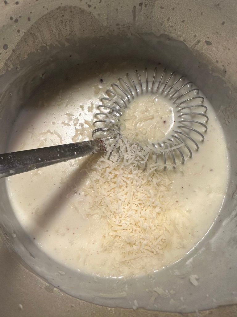 Smelt smøret og tilsæt melet. Når det er opløst, tilsætter du først halvdelen af mælken, og når den er jævnet, tilsættes lidt efter lidt indtil saucen har en cremet konsistens. Tilsæt lidt piskefløde. Tilsæt revet muskatnød, salt og ost.