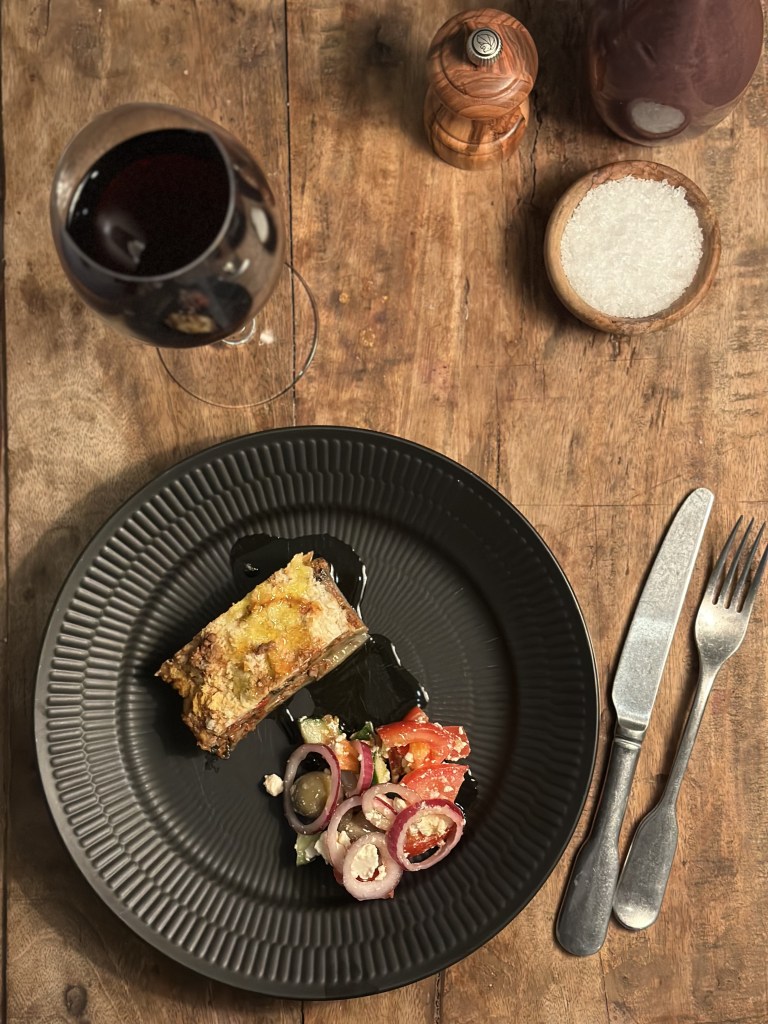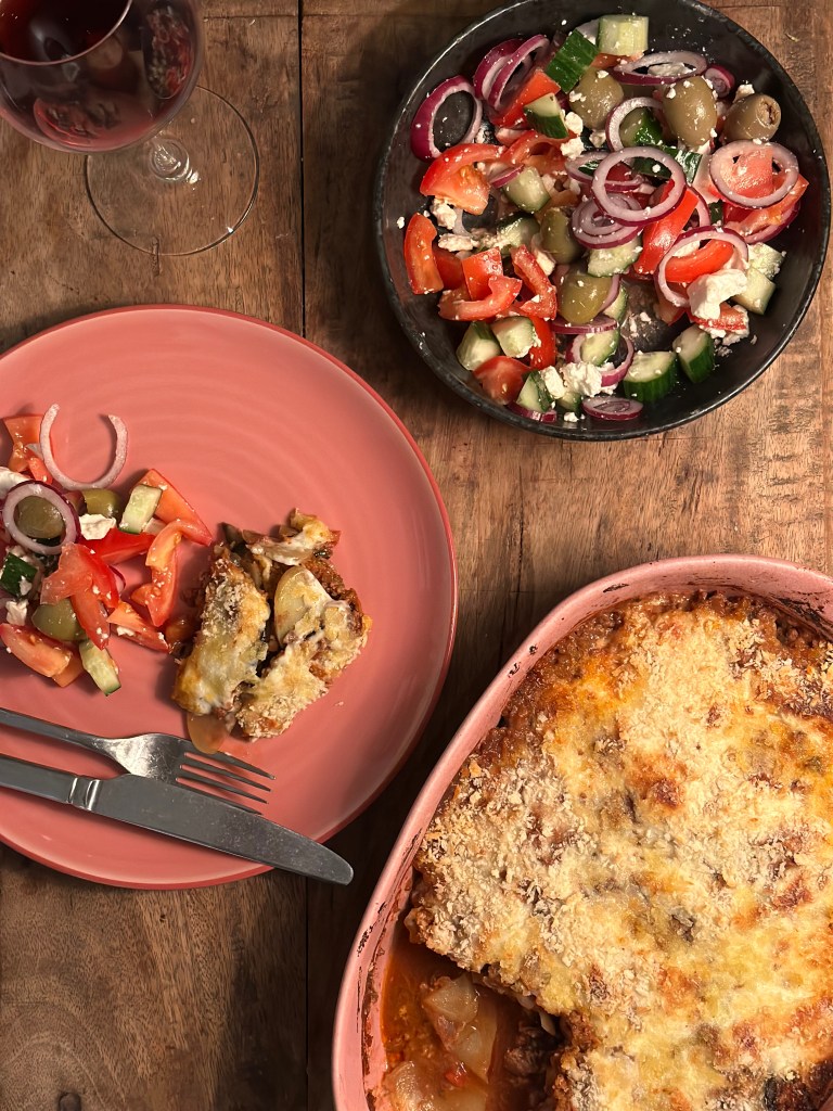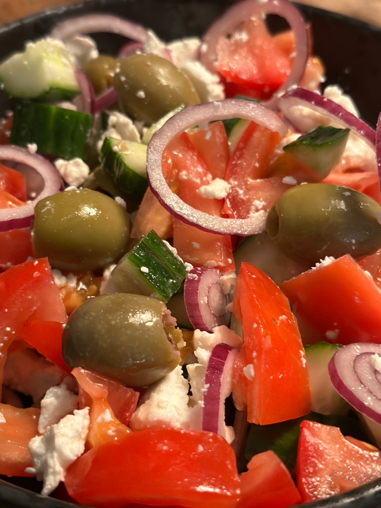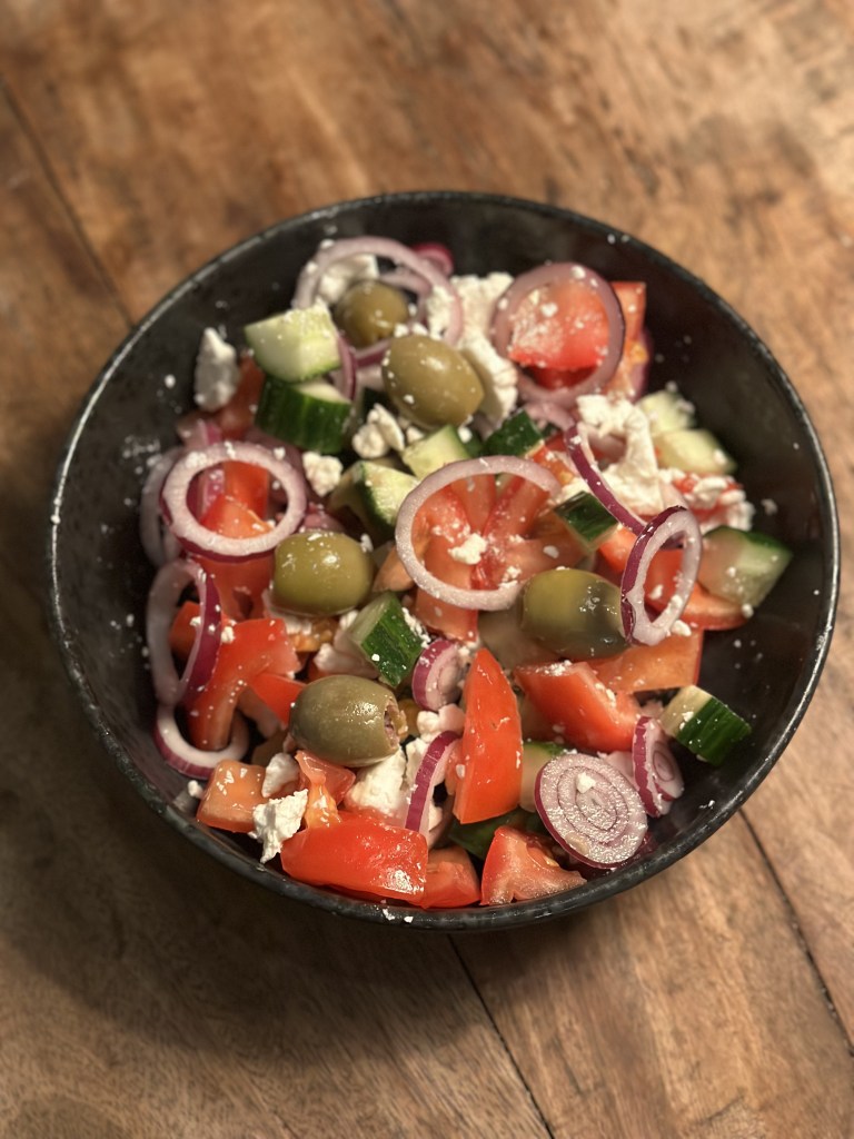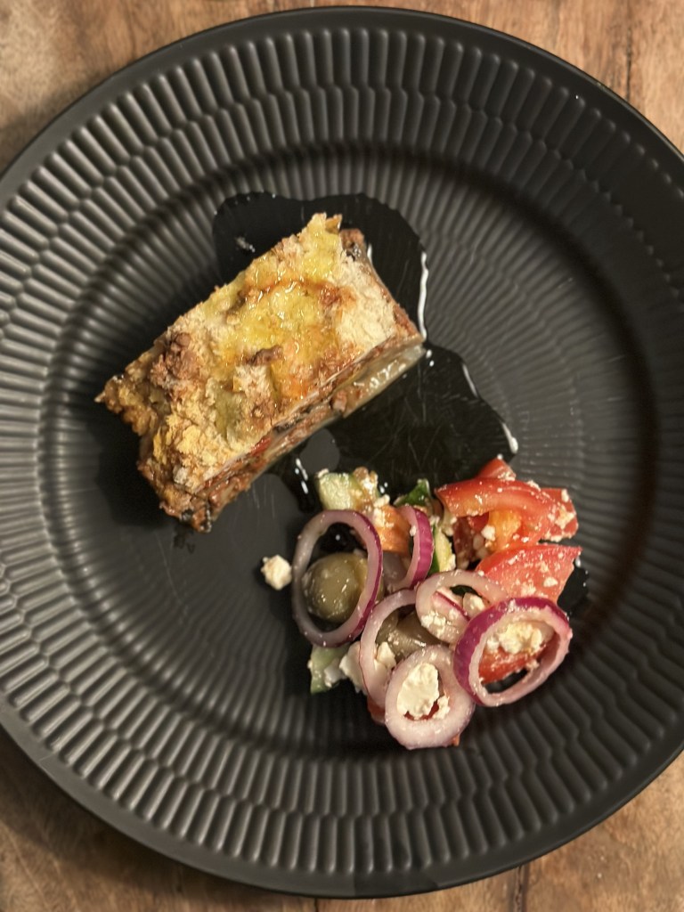 Fadet skal være smurt i olivenolie, og det hele kommer i ovnen i ca. 40 minutter. Jeg serverer med en græsk salat.