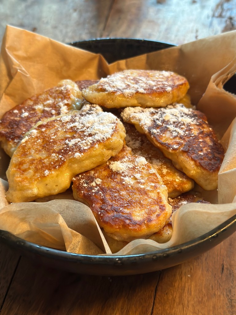 Serveres med en smørklat, kanelsukker og et stort glas solbærsaft.