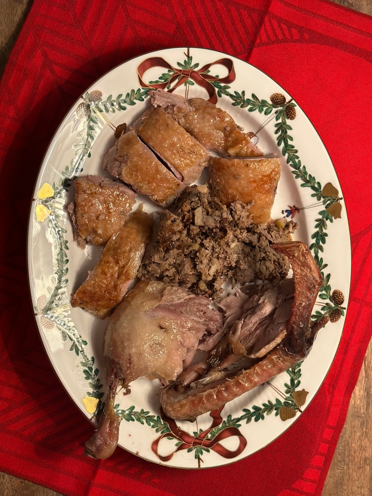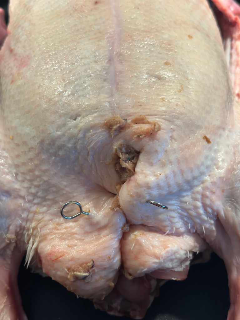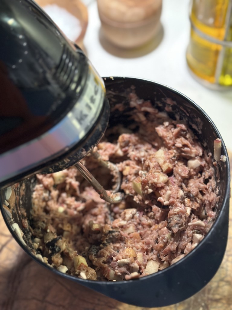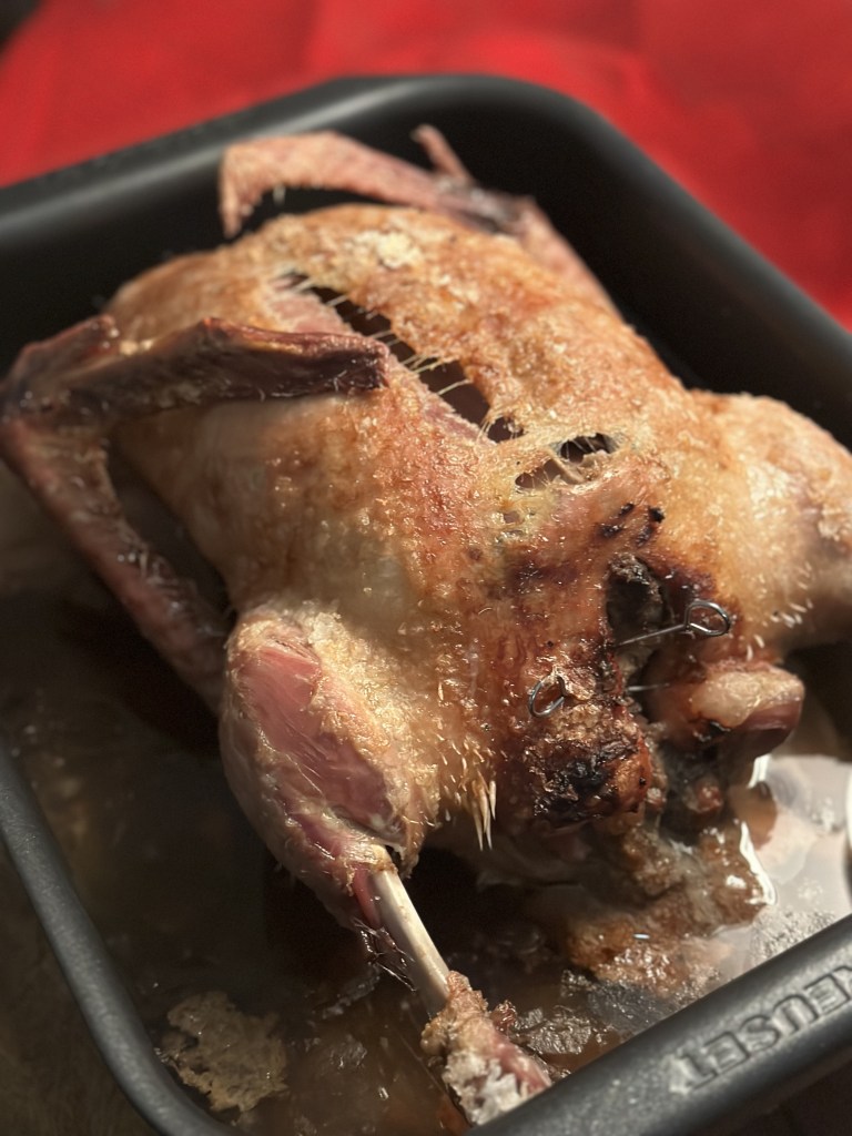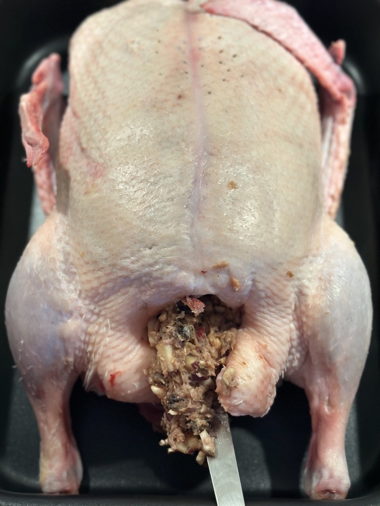 Indmad hakkes fint, og kommes i en minihakker. Snit æbler, svesker, hasselnødder og champignon fint i tern. Snit timian fint – stilken kan godt komme med. Bland de øvrige ingredienser. Jeg plejer altid lige at stege en lille “delle” inden jeg stoffer anden. Tilpas eventuel smagen. Skyl anden med vand – jeg fjerner overflødigt fedt som “slasker”. Fyld anden med farsen og luk med kødpinde.