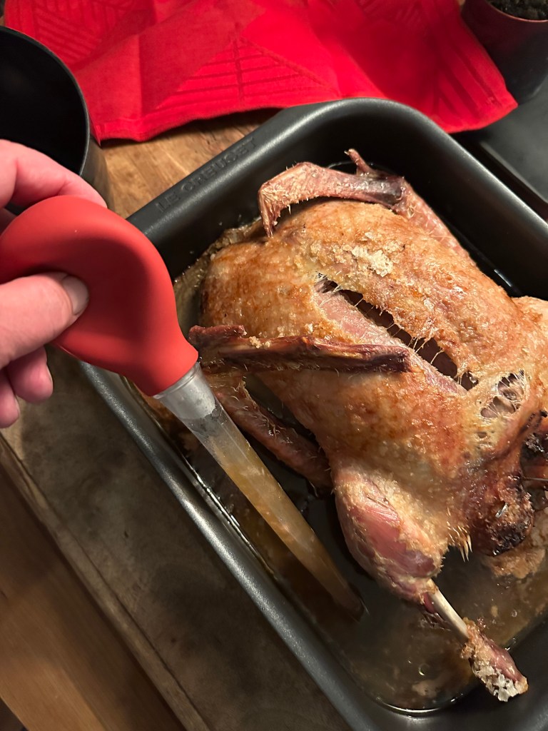 En tommelfingerregel er, at en and skal have en time pr. kilo. Så vejer anden 3,5 kilo, skal den i ovnen i 3,5 timer. Den skal i ovnen ved 150 grader, da den skal langtidsstege. Den placeres i midten af ovnen, og huns vand i bradepanden til fond og skabe damp i ovnen.