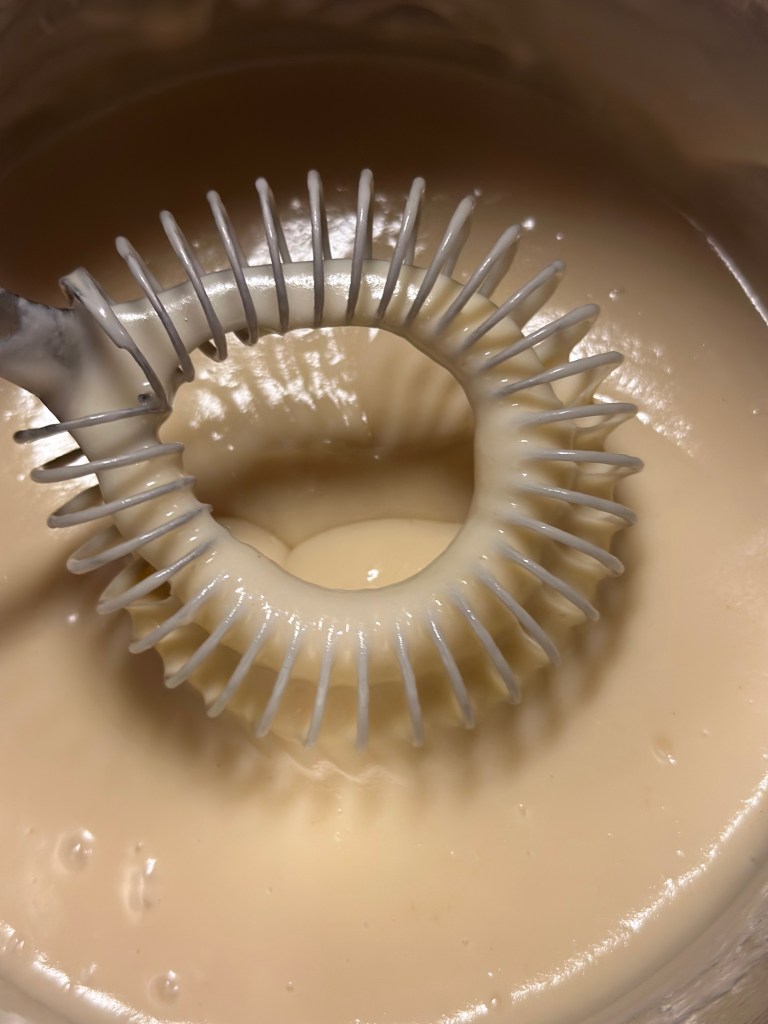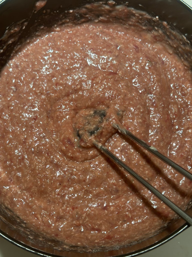Bland de to masser sammen med en ske eller dejskraber. I denne portion er der til dem man hos slagteren vill sige 3-4 små leverpostejer. Du kan fryse dem du ikke bruger, men frys i “rå” tilstand.