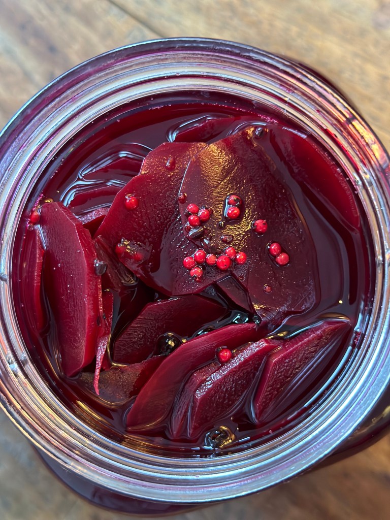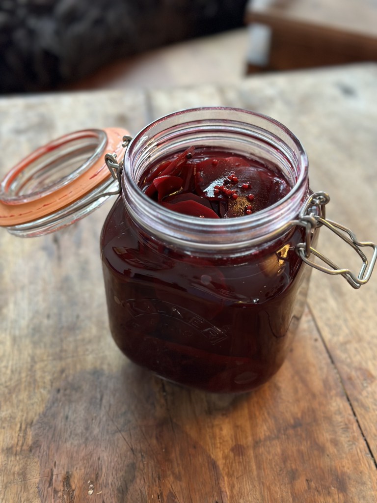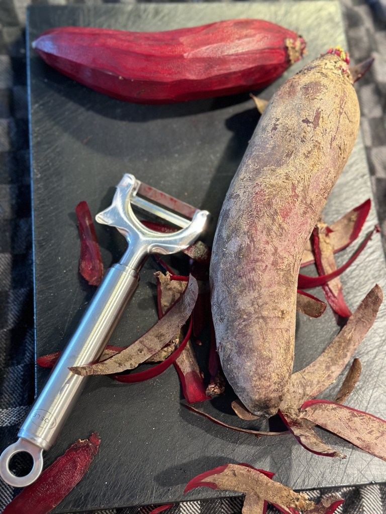 Jeg bruger et mandolin jern, således skiverne af rødbede bliver tyndere end normalt. Det gør dem efter min smag mere delikate.