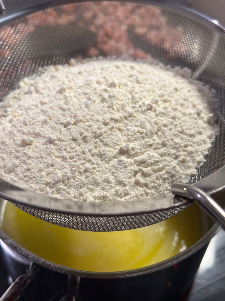 Vand koges op og smør tilsættes. Hvedemel sies i den kogende masse – som røres sammen med en hånd røremaskine mens der er middelvarme på.